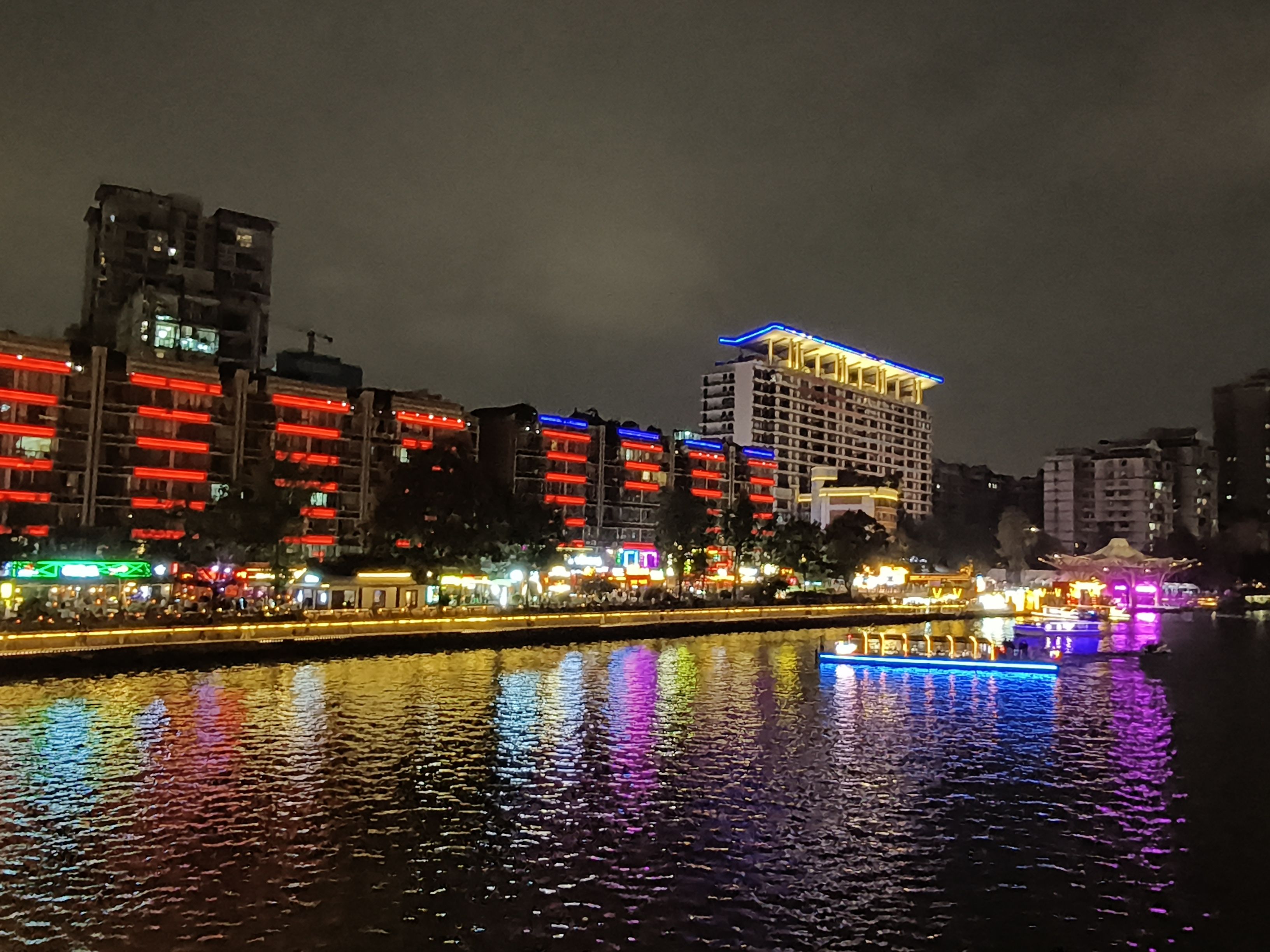 吃完晚饭,再次打车前往“九眼桥”,此时华灯初上,夜幕降临。沿着河边漫步,欣赏着两岸灯火璀璨、游艇在江面穿梭的繁华景象。微风拂面,凉爽舒适,令人倍感惬意。