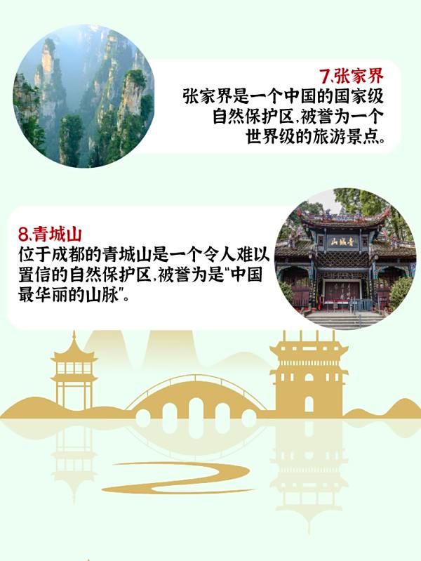 7、张家界:张家界是一个中国的国家级自然保护区,被誉为一个世界级的旅游景点。