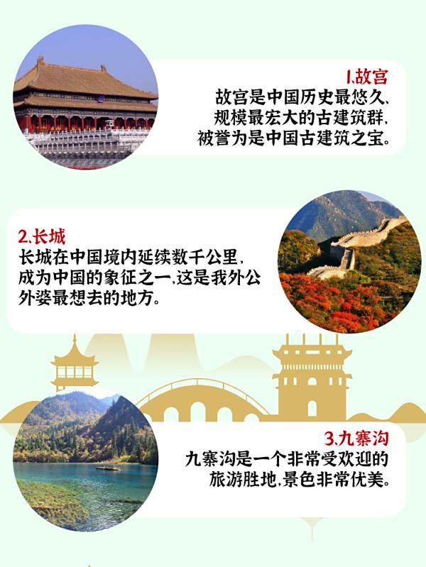 2、长城:长城在中国境内延续数千公里,成为中国的象征之一,这是我外公外婆最想去的地方。