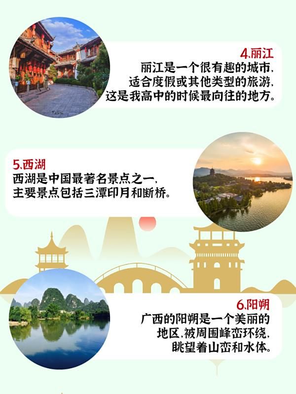 5、西湖:西湖是中国最著名景点之一,主要景点包括三潭印月和断桥。