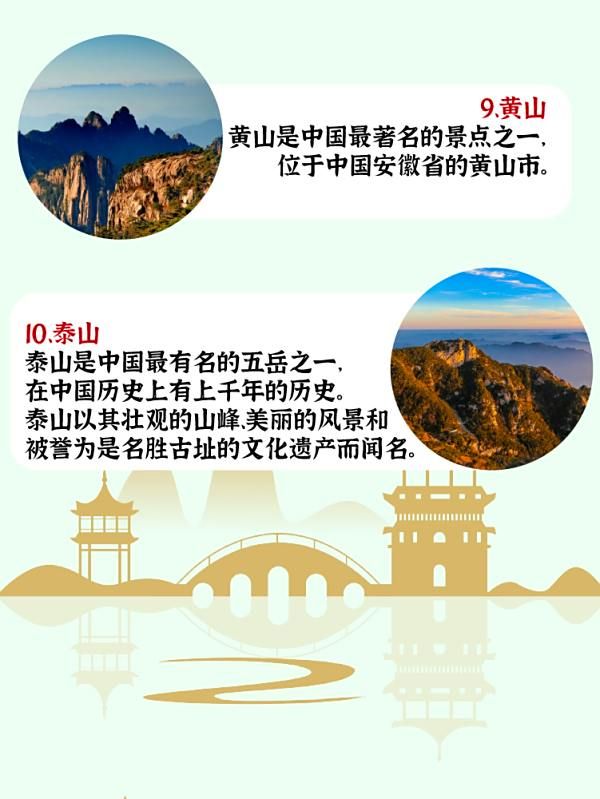 10、泰山:泰山是中国最有名的五岳之一,在中国历史上有上千年的历史。泰山以其壮观的山峰、美丽的风景和被誉为是名胜古址的文化遗产而闻名。