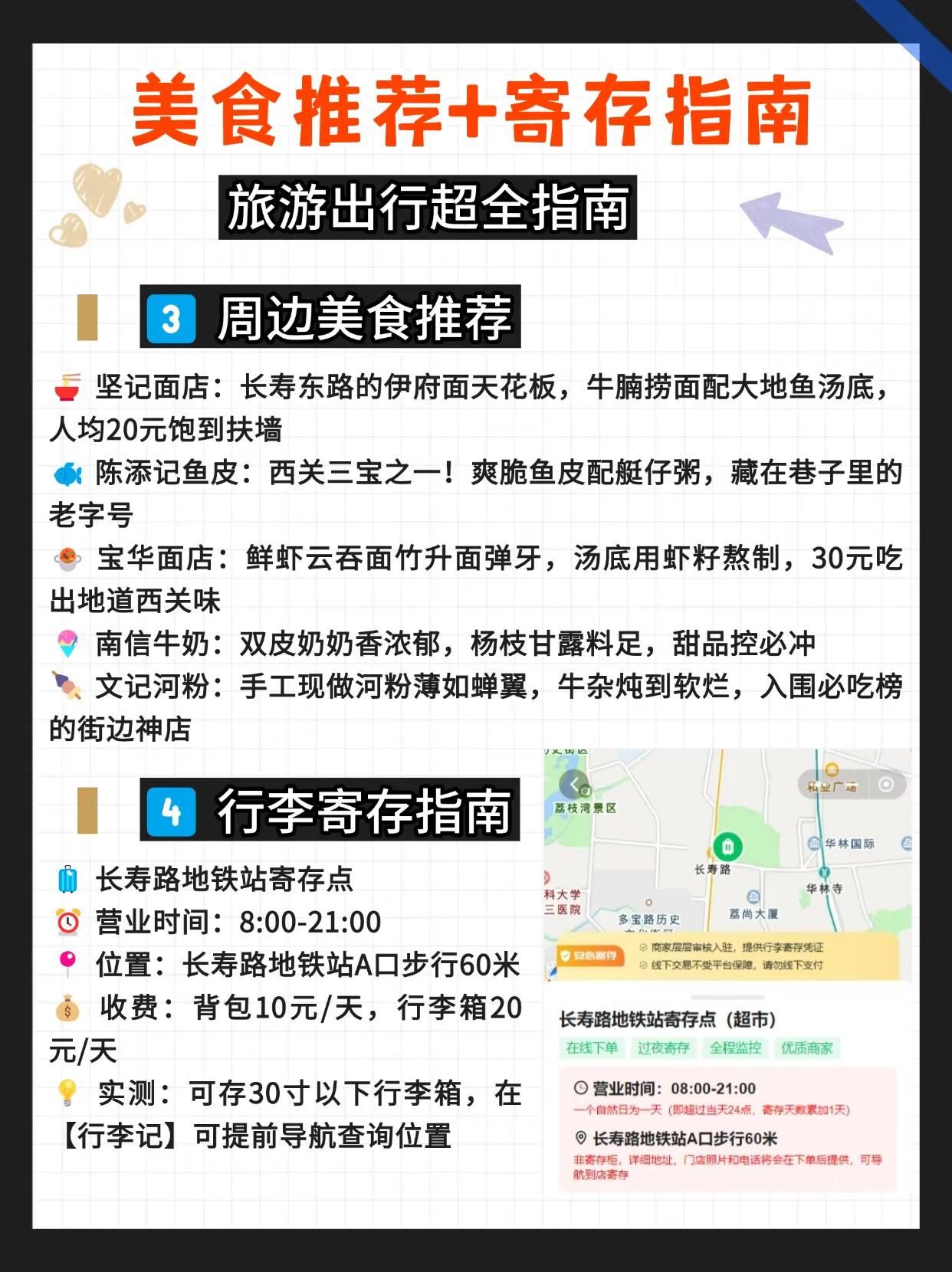 广州长寿路游玩攻略!附行李寄存指南~。 游玩路线上午:长寿路地铁站华林寺源胜街古董市场西关大屋下午:荔湾湖公园(粤曲表演)永庆坊(月亮桥)上下九步行街晚上:沿江西路夜景沙面岛灯光秀 节奏安排:上午感受千年禅意与市井烟火,下午沉浸岭南园林与文艺街区,夜晚打卡珠江畔的复古光影! 必打卡景点 华林寺 源胜街古董市场 西关大屋 荔湾湖公园 永庆坊月亮桥 周边美食打卡 坚记面店:长寿东路的伊府面,牛腩捞面配大地鱼汤底,人均20元饱到扶墙 陈添记鱼皮:西关三宝之一!爽脆鱼皮配艇仔粥,藏在巷子里的美食 宝华面店:鲜虾云吞面竹升面弹牙,汤底用虾籽熬制,30元吃出地道西关味 南信牛奶:双皮奶奶香浓郁,杨枝甘露料足,甜品控必冲 文记河粉:手工现做河粉薄如蝉翼,牛杂炖到软烂,入围必吃榜的街边神店 行李寄存指南 长寿路地铁站寄存点 营业时间:8:00-21:00 位置:长寿路地铁站A口步行60米 收费:背包10元/天,行李箱20元/天 实测:可存30寸以下行李箱,在【行李记】可提前导航查询位置 Tips 避坑指南:华林寺玉器市场谨防高价套路,不懂行建议只逛不买永庆坊周末人流量大,建议错峰上午打卡,下午茶选周边咖啡馆 交通:地铁1号线长寿路站直达,老城区道路狭窄,建议步行或共享单车 拍照技巧:西关大屋下午4点光影蕞佳,穿浅色衣裙更出片沙面岛夜景用手机长曝光模式拍欧式建筑倒影 装备:夏季多阵雨,随身带伞+驱蚊液;穿舒适平底鞋,石板路易滑 “半日看尽千年西关,一街吃遍广府百味” 长寿路是广州的时光胶囊,收藏这篇,带你穿越市井与摩登!#行李寄存 #行李记小程序 #广州 #广州旅游攻略 #广州旅游