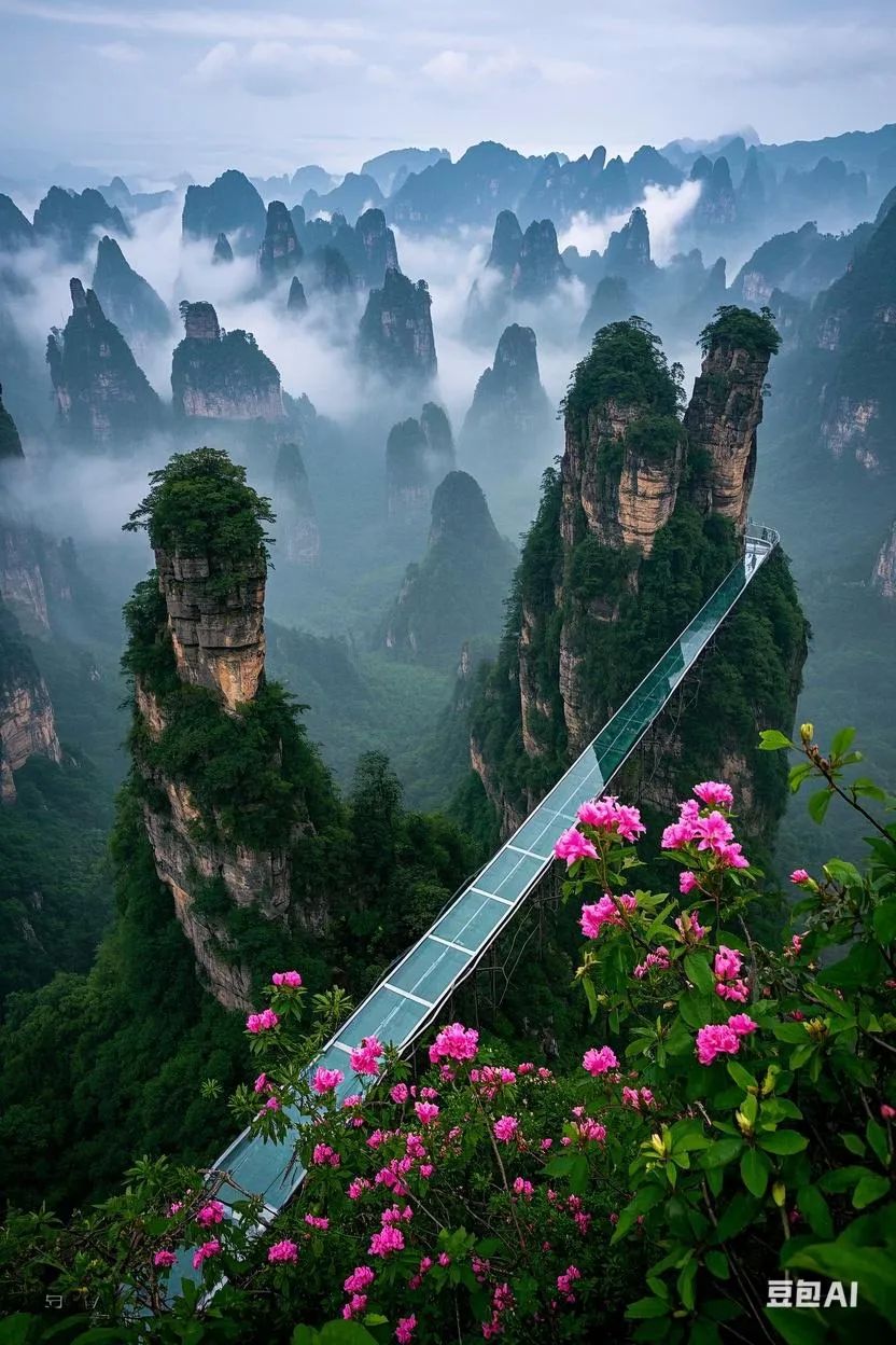 张家界的天门山玻璃栈道与袁家界石柱林在春日云雾中更显神秘。四月的杜鹃花点缀山间,为险峻的山峰增添一抹柔美。