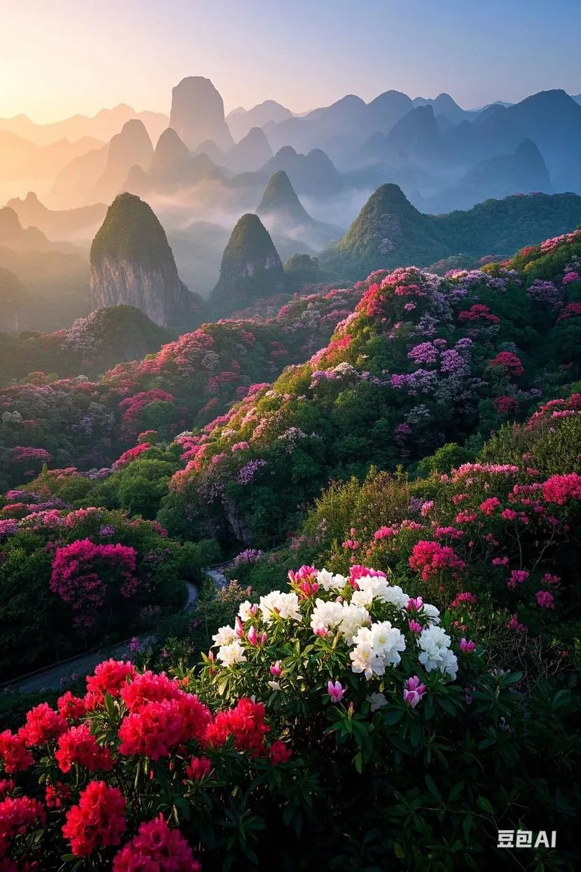毕节百里杜鹃景区内,绵延百里的野生杜鹃花在四月形成“地球彩带”奇观。红、粉、白三色花朵交织,与喀斯特地貌相映成趣,堪称自然界的视觉盛宴。