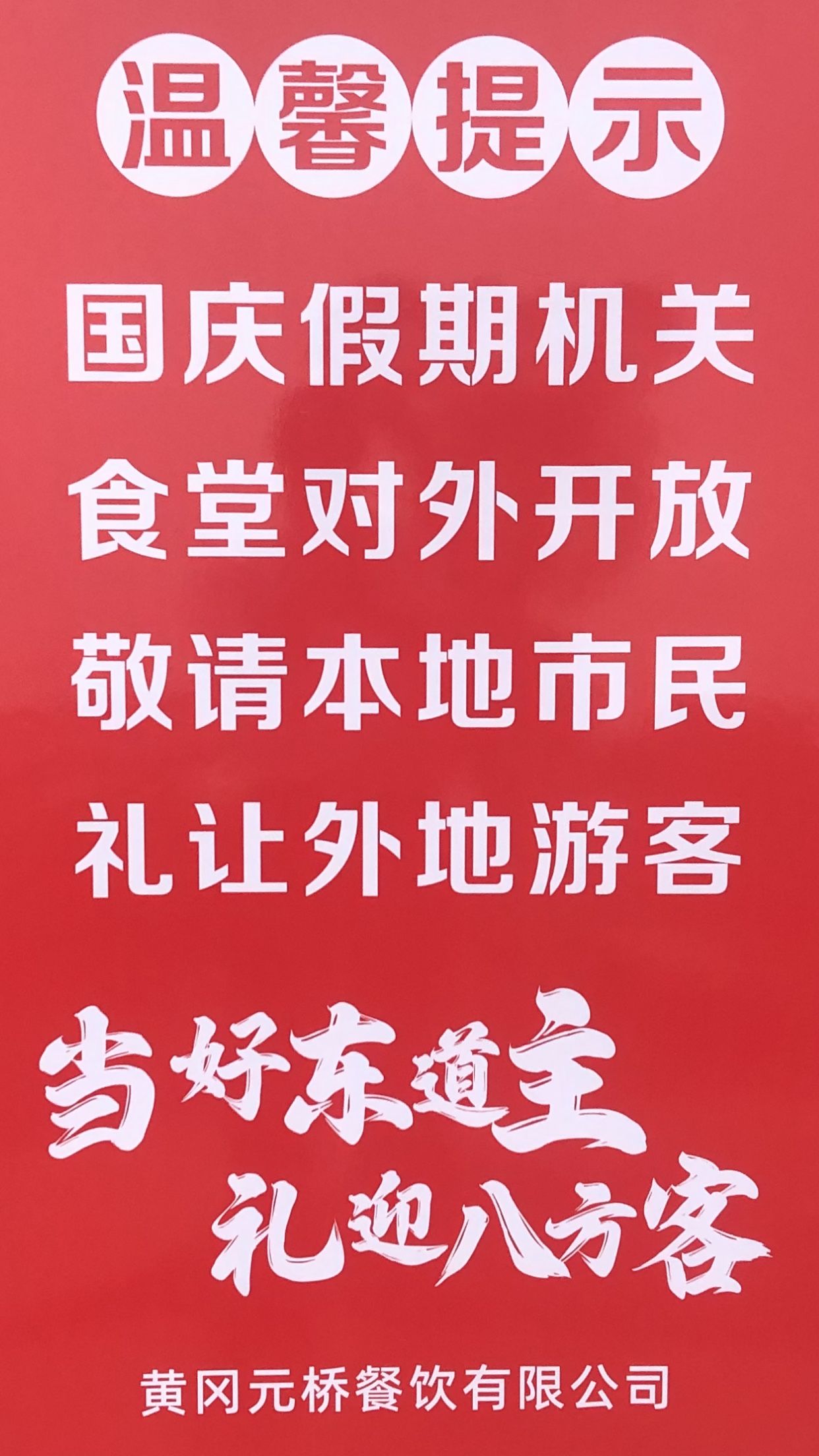 特别感谢东道主黄冈市和黄州区政府,国庆假期市区公交车免费,黄州区政府大院内对外开放免费停车,黄州区委机关食堂对外来游客开放,15元四菜一汤自助餐,既能吃饱又能吃好。为黄冈市黄州区贴心周到的服务点赞![赞][赞][赞]