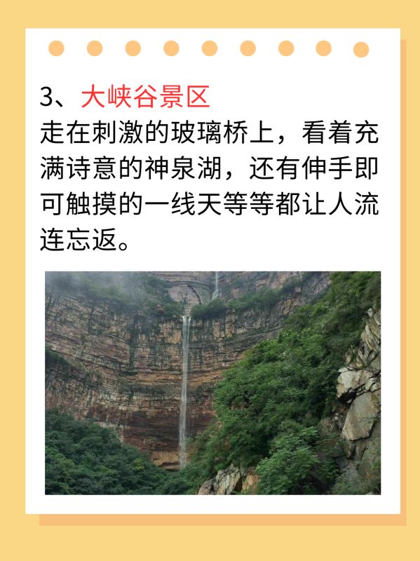 - 自然奇观:以天门洞著称,天门洞是自然形成的巨大穿山溶洞,气势磅礴。
