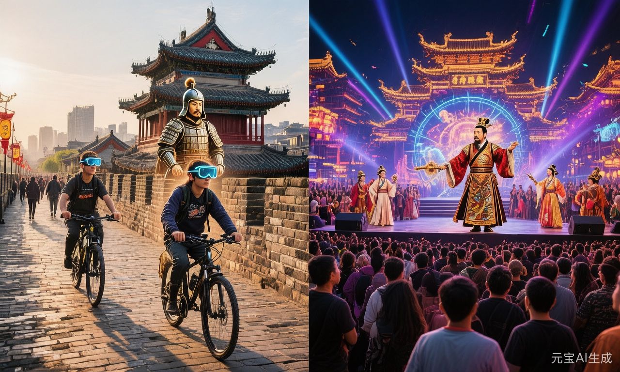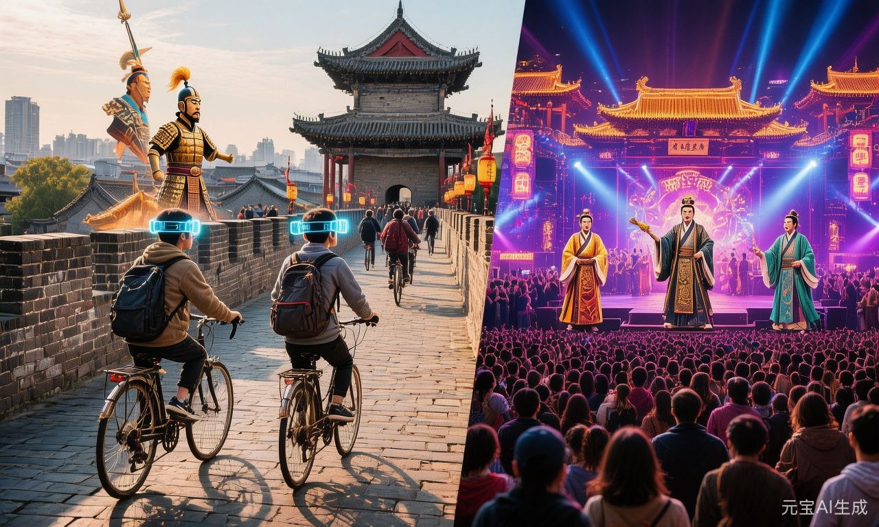 清晨的西安还裹着薄雾,直奔永宁门。建议选8点前到,城墙下的早市正热闹,油泼面摊的热气混着甑糕的甜香,先垫个肚子再登城更有劲儿!【图1】租辆双人自行车(45元/3小时),沿着13.74公里的城墙慢慢晃。向西骑到箭楼段,视野突然开阔——内侧是青瓦飞檐的老城区,外侧是现代高楼的剪影,这种“古今同框”的震撼,比照片更立体。中途在“敌楼”歇脚,AR导览眼镜租30元/副,举着它对准城墙垛口,明代士兵巡逻、擂鼓示警的场景“活”了,连箭簇的寒光都清晰可见!
