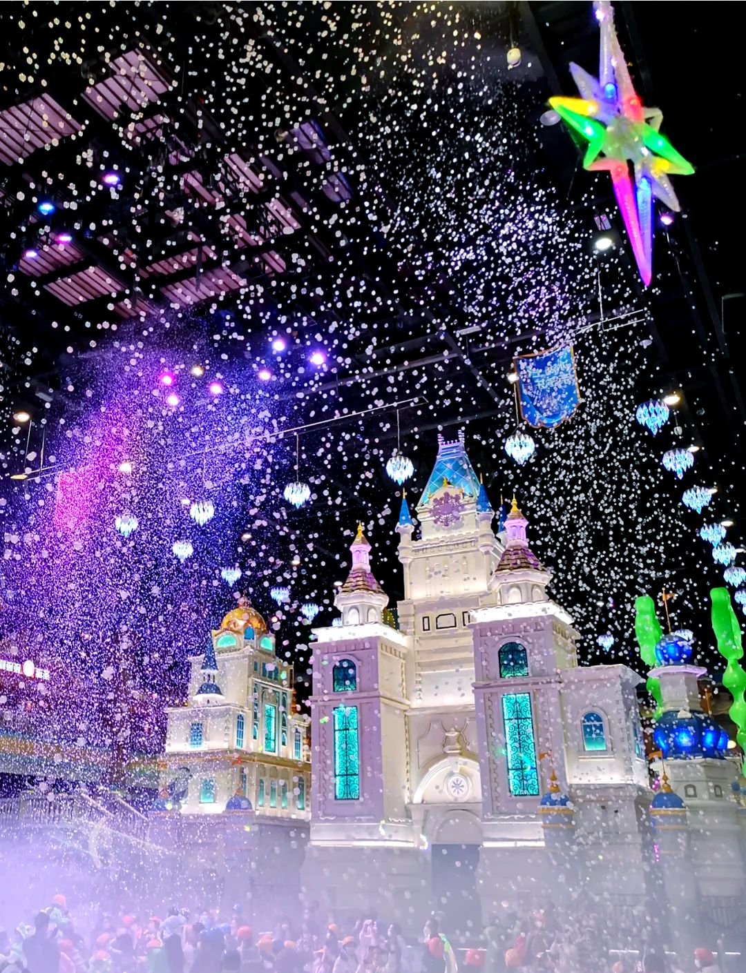 • 动态光影系统:冰湖区域的LED地屏与投影技术结合,白天呈现清澈的冰面反射效果,夜晚则切换为极光模式,紫色与蓝色的光带随音乐流动,营造出“北极光下滑冰”的梦幻场景。