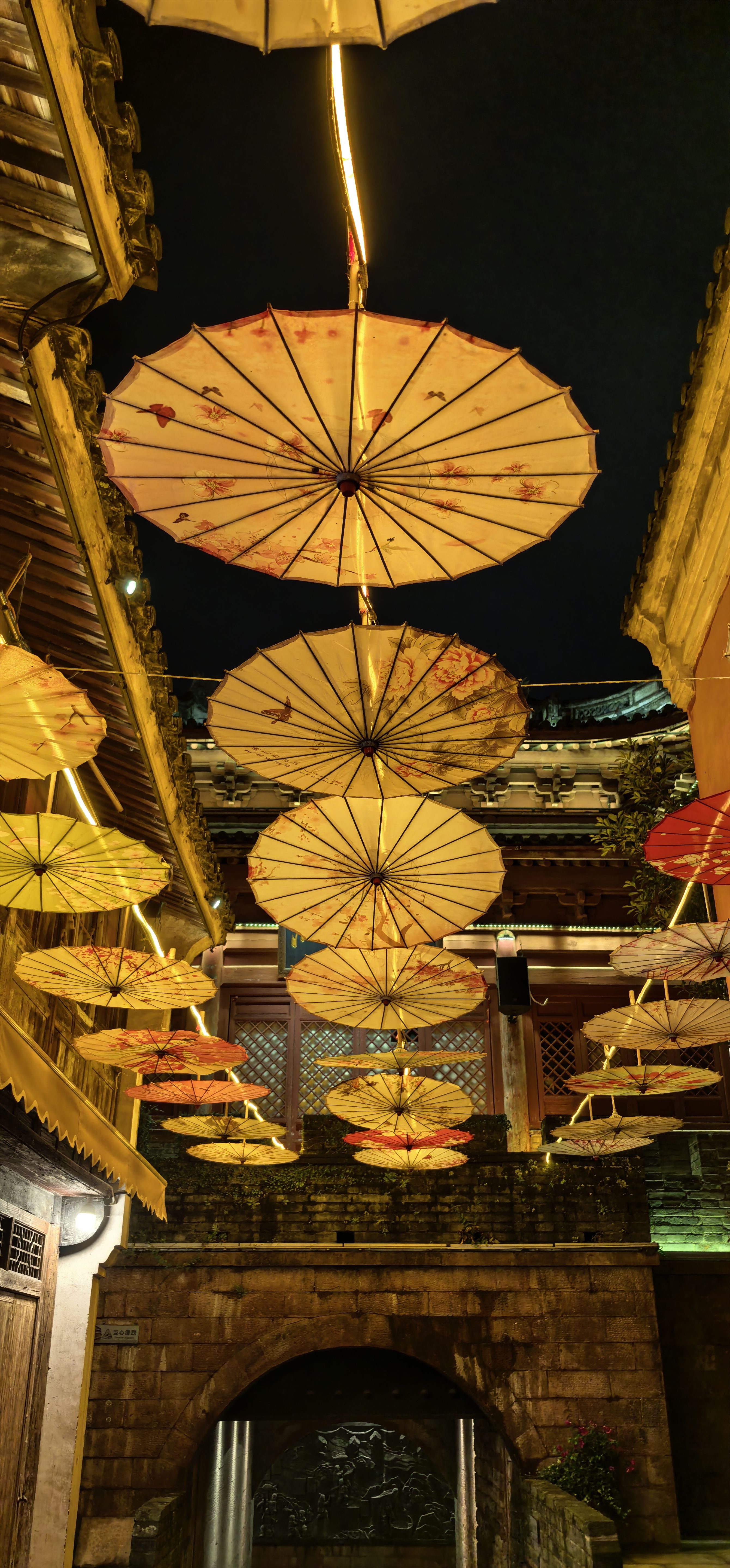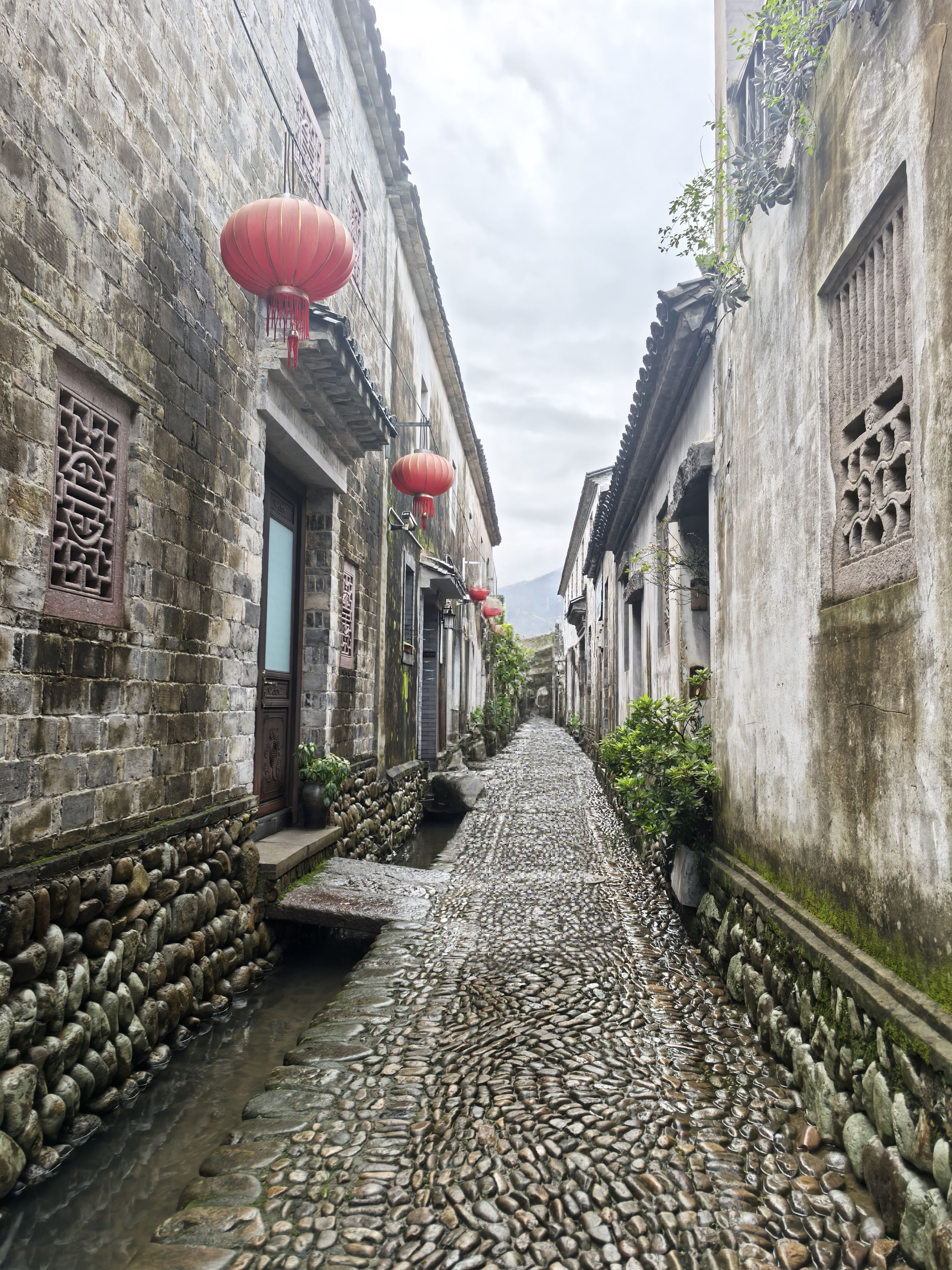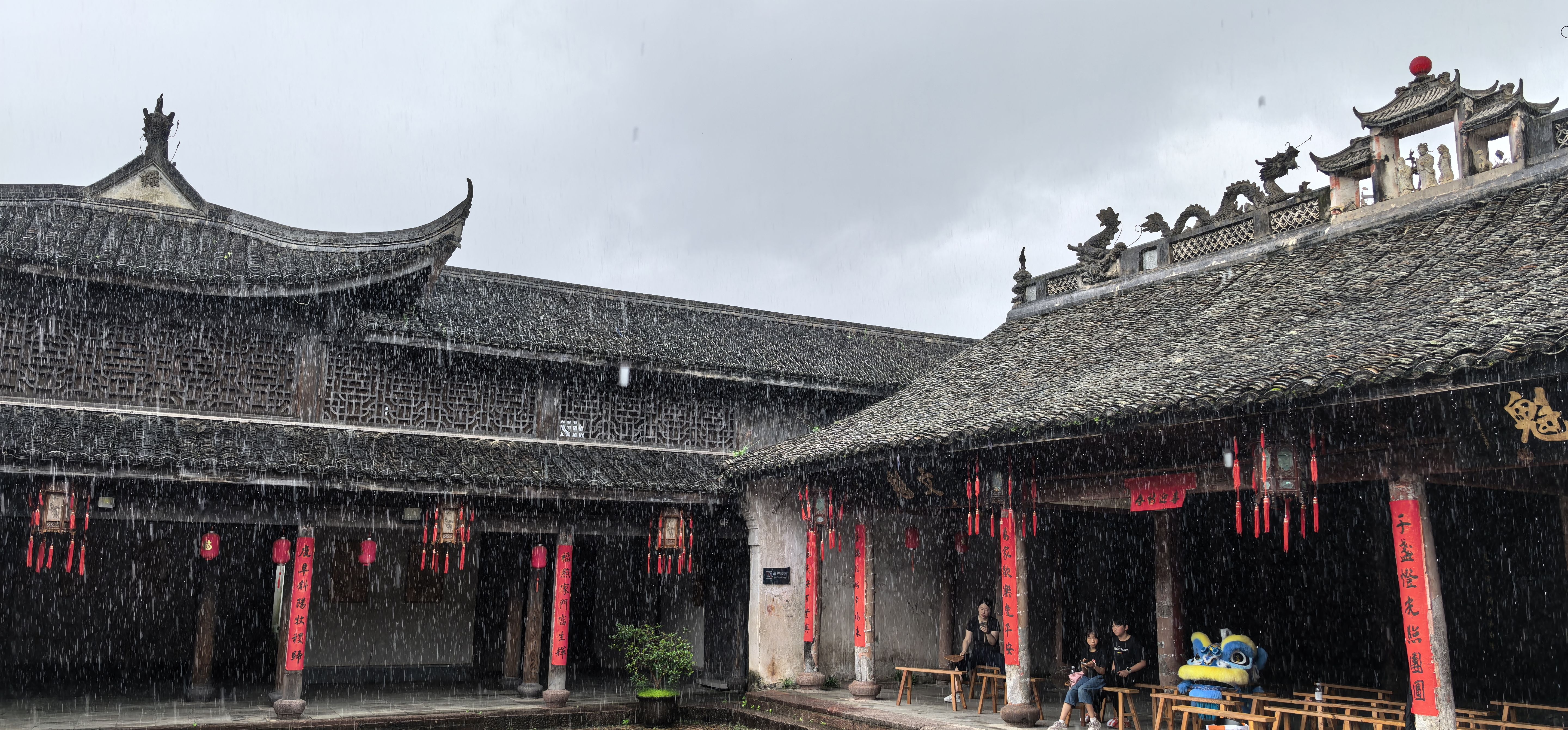 古镇不大,开发的游览路线就纵横两条主街,两旁挂满红灯笼。街中有溪水流过,居民在溪边洗衣、洗花生,生活气息扑面而来。阳光有点烈,我们撑着伞沿街漫步,走到戏院时,正赶上一段越剧表演。坐下听了一会儿,虽然词儿听不懂,但曲调婉转,很有韵味。正意犹未尽,散场时却下起了雨。雨不大,但密得很,游客纷纷躲进厅里。这时一个漂亮的狮子头映入眼帘——原来接下来是舞狮表演,一群年轻孩子正在热身,准备上台。