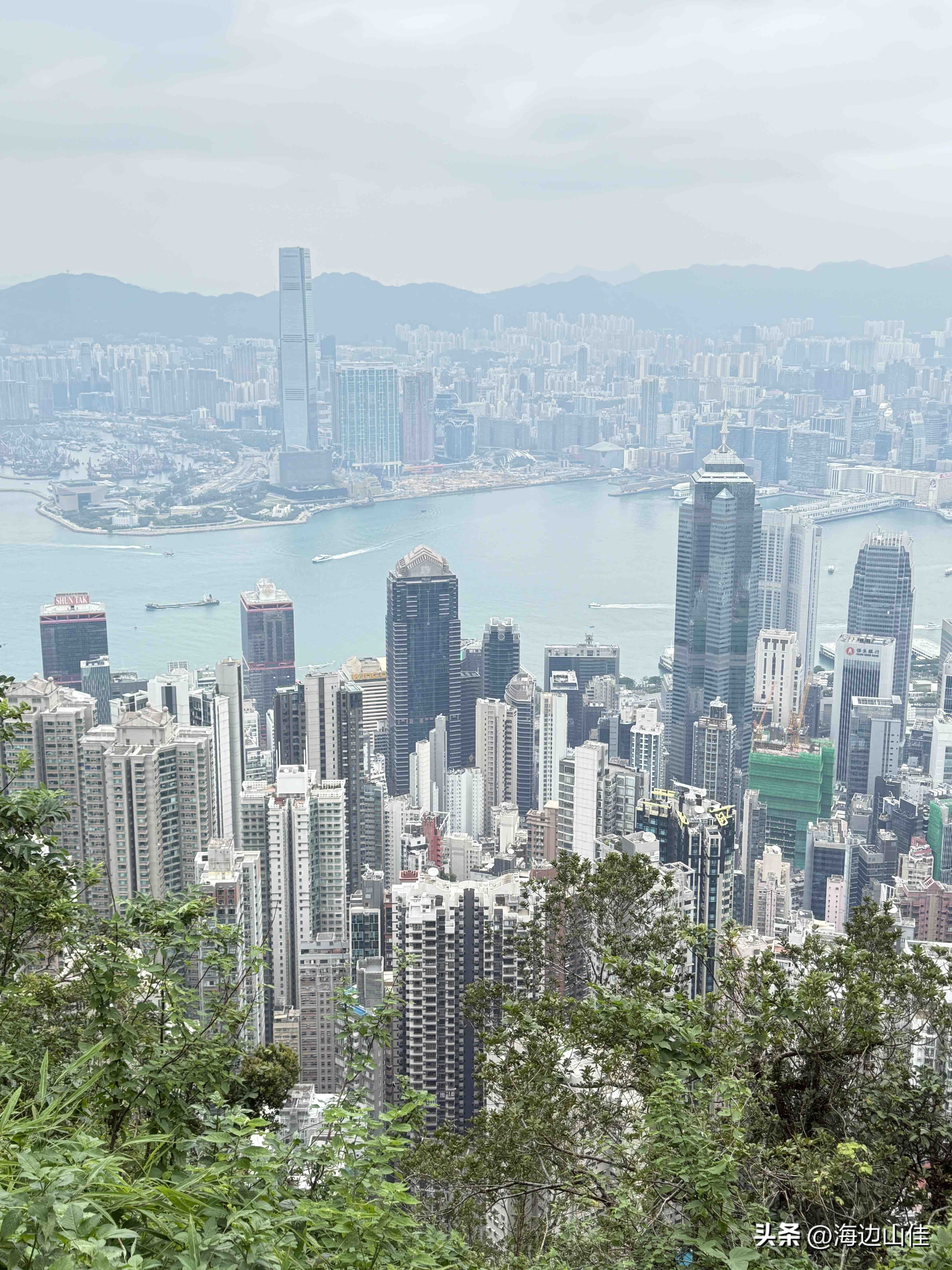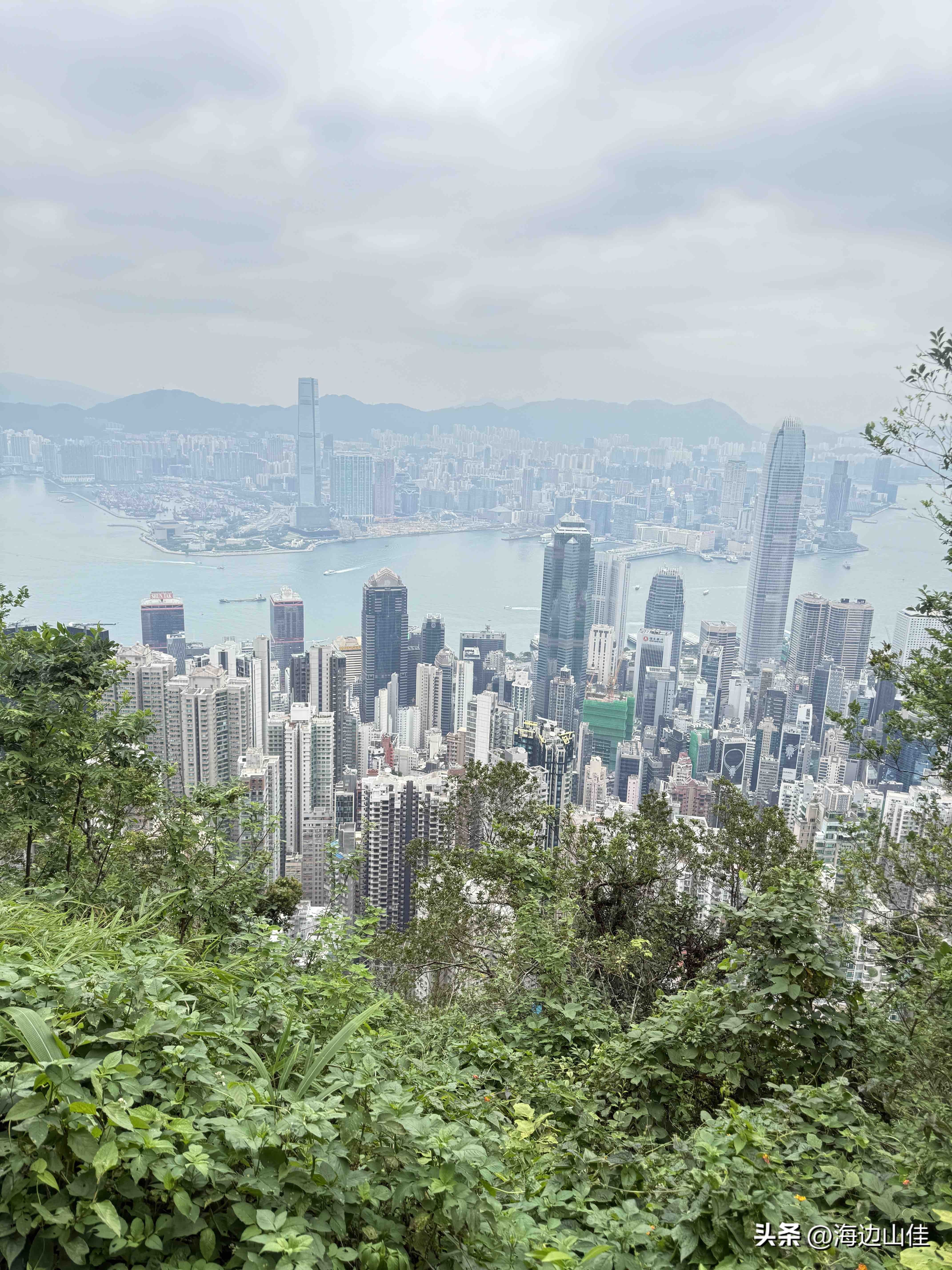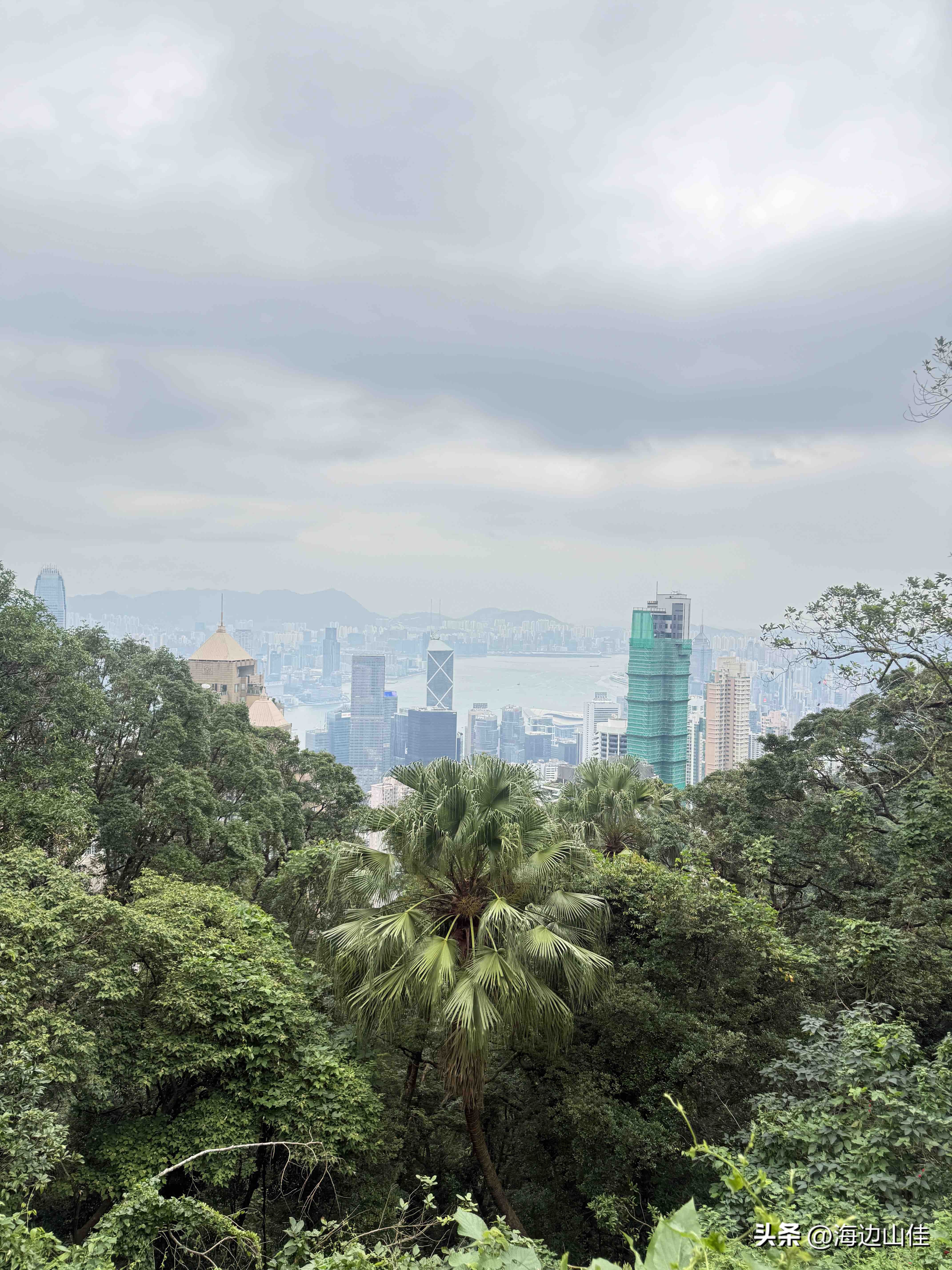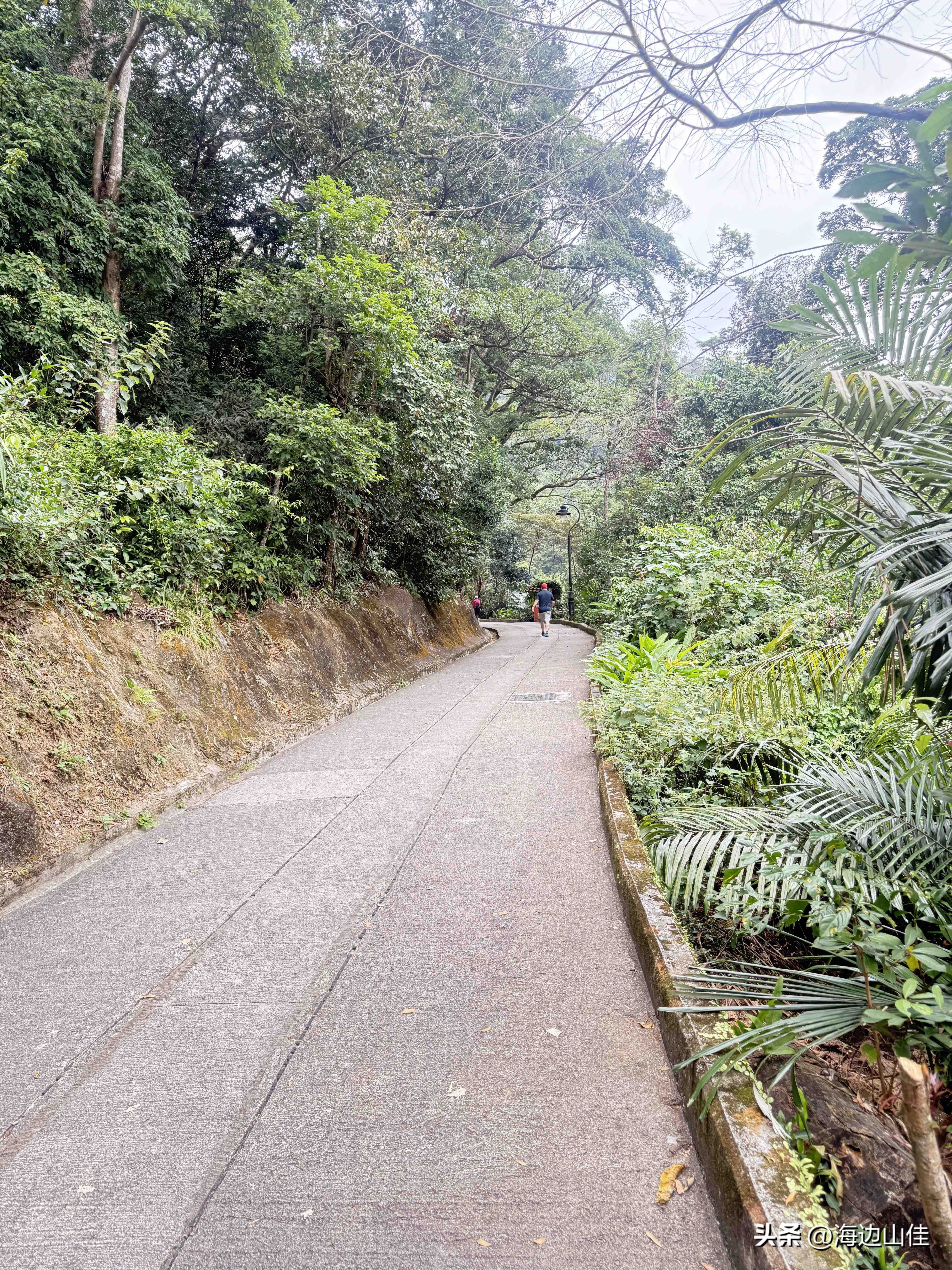 昨天是周末,我们夫妻二人准备了徒步的装备,带了拐杖水和遮阳帽一大早从深圳来到了香港的中环,然后从这里出发,沿阶而上,路过兰桂坊,走出市区,步行沿着旧登山道开始爬太平山,以前我们也多次来到过这里,但每次都是选择坐大巴或是坐缆车上去的,这次之所以选择步行,是想慢慢欣赏一下途中的风景,呼吸下山林中新鲜的空气,的确我们这一路上行,山中树木茂盛、郁郁葱葱、遮天蔽日,人也不很多,空气很好,小路蜿蜒曲折,都是坡路,也很少有台阶,走起来一点不吃力,非常不错,外加沿途还有著名的香港半山豪宅区,看着很普通的一个个小房子,差不多都价值上亿,据说香港的大部富豪们都住在此地,我们到此一游,也算见识到了什么是豪宅,走了近一个半小时,我们到了山顶的缆车站、凌霄阁和山顶广场,这里的风景更是震撼,整个维多利亚港,中环高楼嶙立的金融商业区,甚至整个香港都尽收眼底,美轮美奂,绝对是拍照的绝佳地点,虽然今天有点天公不作美,不算是个大晴天,但还好景色也都看得清,我们也是一通过瘾的拍照。