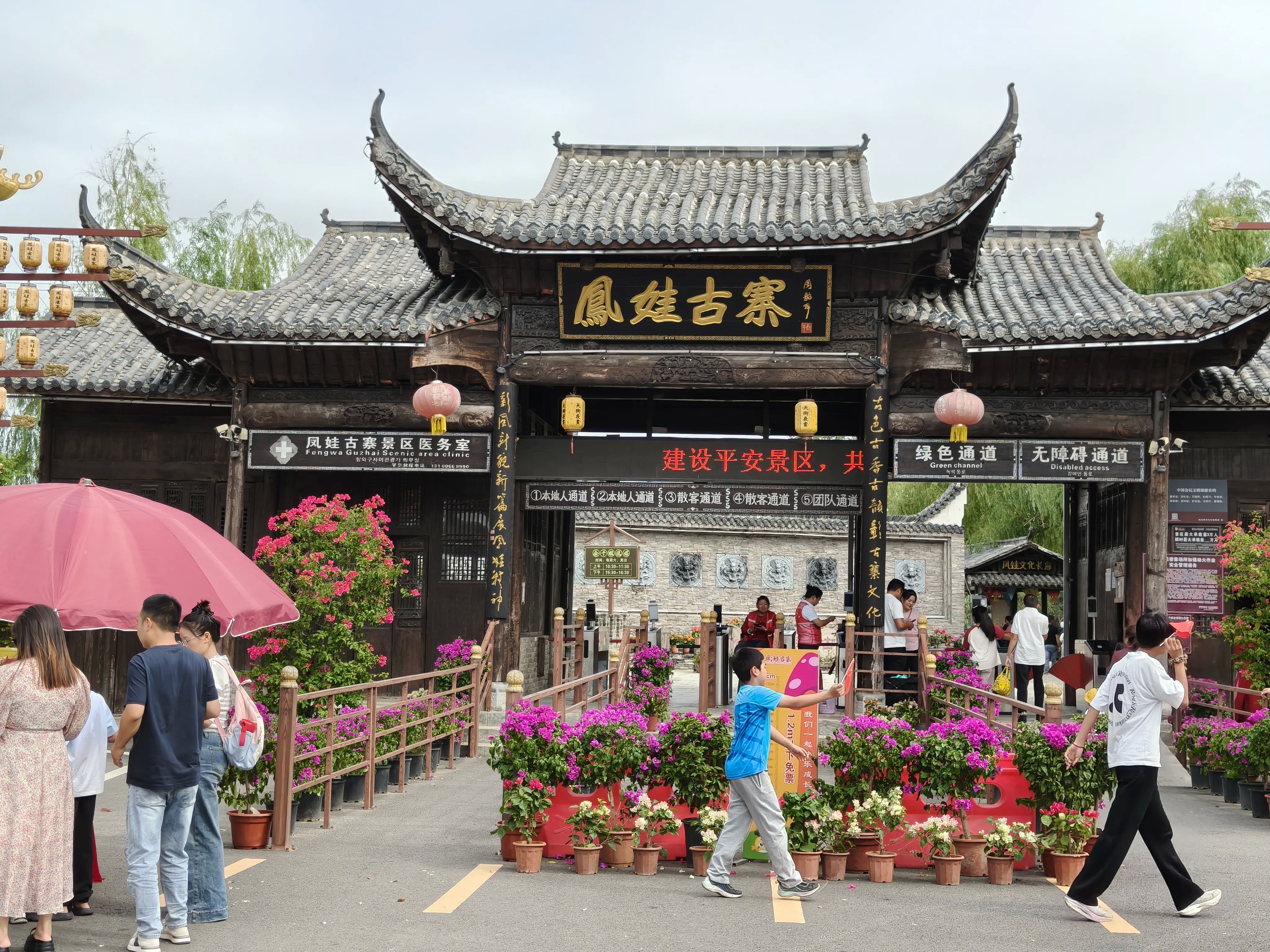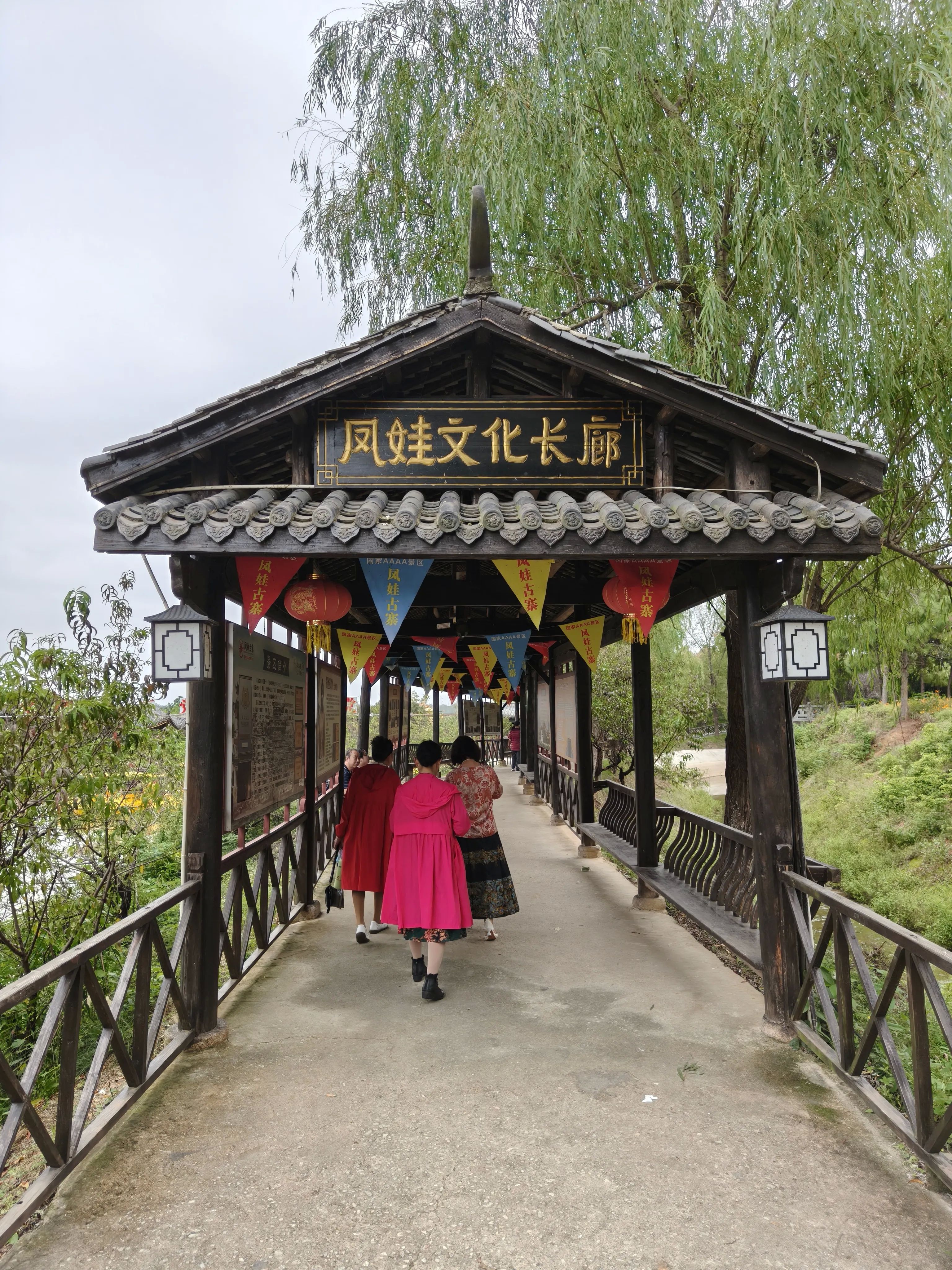 开了大概一个半小时,我们就到了凤娃古寨。景区门头是那种古色古香的建筑。进入景区内第一个就需要穿过凤娃文化长廊,里面介绍了好多当地的民俗文化,还有景区内部的游玩特色项目。最显眼的建筑就是那个巨大的“一桶天下”,特别有意思。