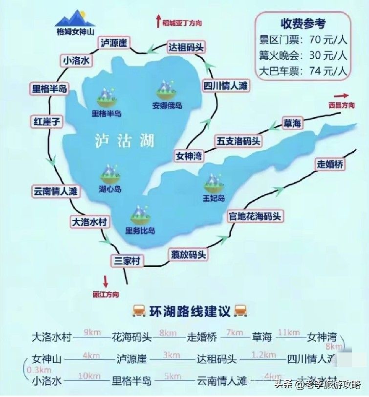 亮点: 草海走婚桥的文化体验,女神湾的极致湖景,探访小众喇嘛寺。