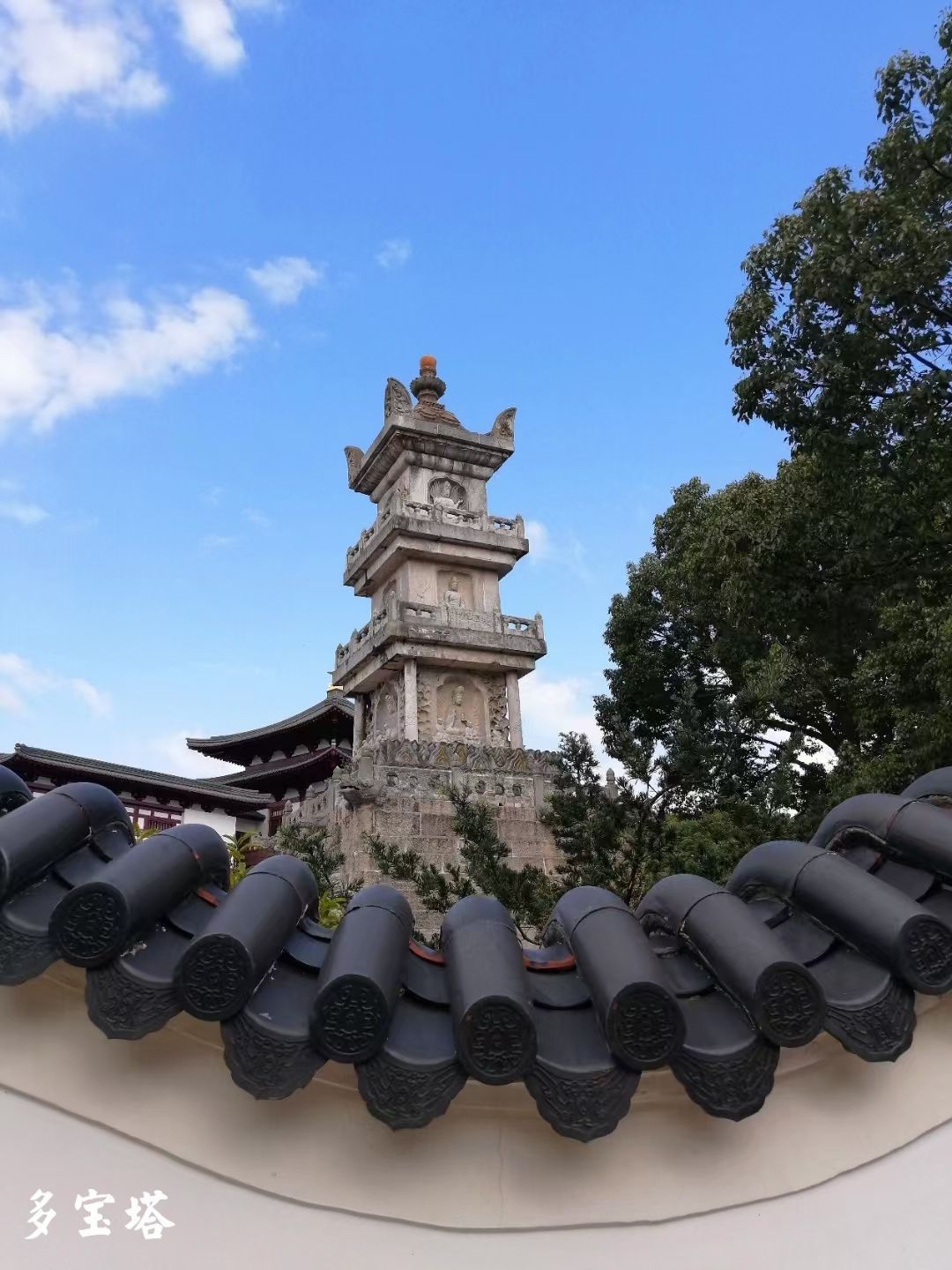 多宝塔取《法华经》“多宝佛塔”之义而定名,是普陀山唯一保持原貌的最古老的建筑物,它与法雨寺中明朝南京故宫惟一存世的宫殿建筑九龙殿、杨枝庵中根据初唐著名大画家阎立本绘的观音画像刻成的杨枝观音碑和佛顶山上稀世物种鹅耳枥树,合称为“普陀四宝”。我们到的时候,因建筑保护不能入内,但在院墙外的瞻仰已经得幸见识到了其尊容,佛光满园,更增灵秀。
