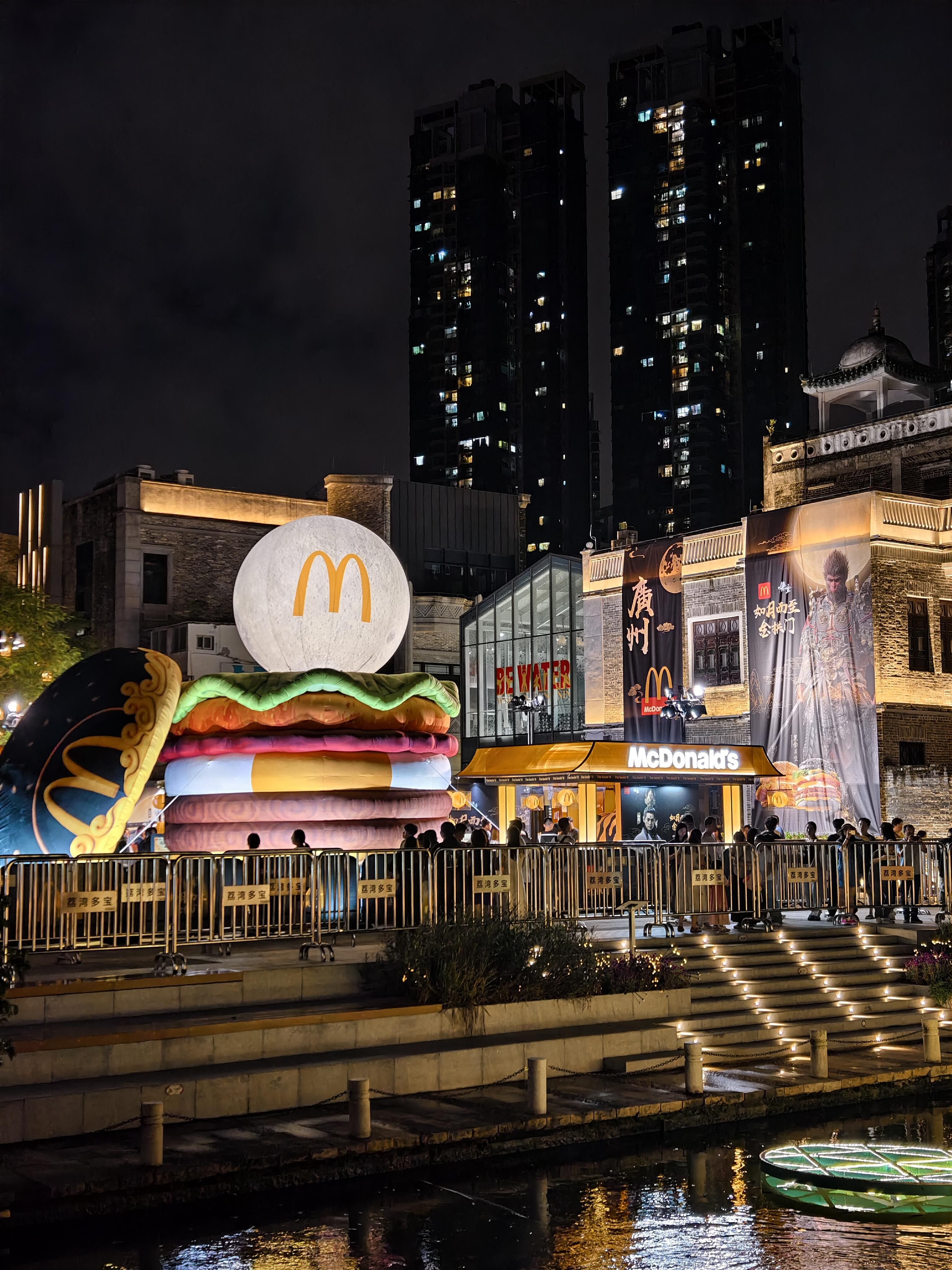 逛吃路上惊喜与遗憾掺半:陈家祠的雕梁画栋、大佛寺的流光溢彩(图4必看,还能瞻仰舍利)让人挪不开眼,可南越王博物馆下墓要额外花钱、北京路的陈添记鱼皮和聚宝乳鸽皇味道平平;永庆坊的月亮桥没想象中出片,倒是麦当劳黑神话联名(图7)意外好拍;兴悦酒家的叉烧包没吃到,陶陶居的烧鹅和金钱肚却补了遗憾,西华路珍珍小食的牛腩粉够香但齁咸,食盈碗仔翅倒是值得一试。