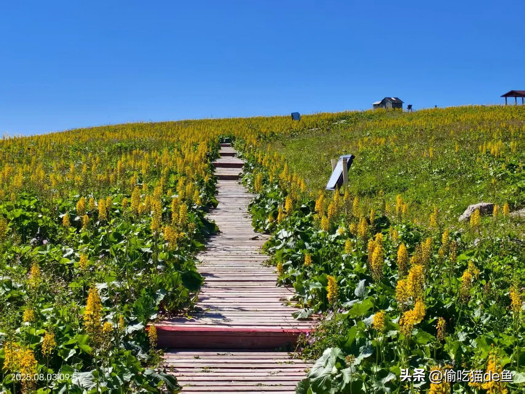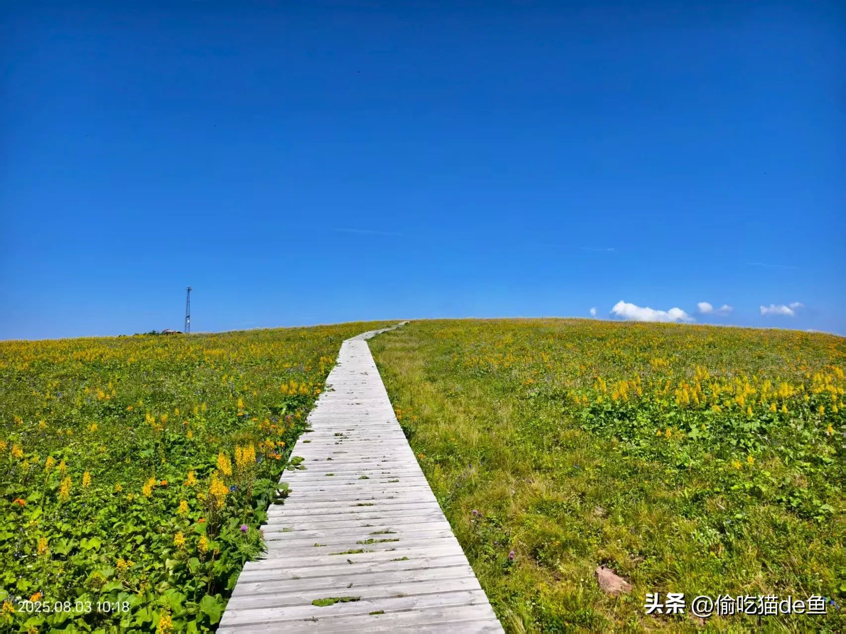 8月3号上午一早去景区门口排队换票(就是一片纸,上面写上几人,太不正规了),景区8点上班,换票耽误了好大一会,然后坐景交直奔舜王坪。到地方下车大概走1公里上坡路就到了舜王坪大草坪栈道起点。8月3号当天是大晴天,天气很好,温度不高,上午10点多的时候也才22℃,但是比较晒。
