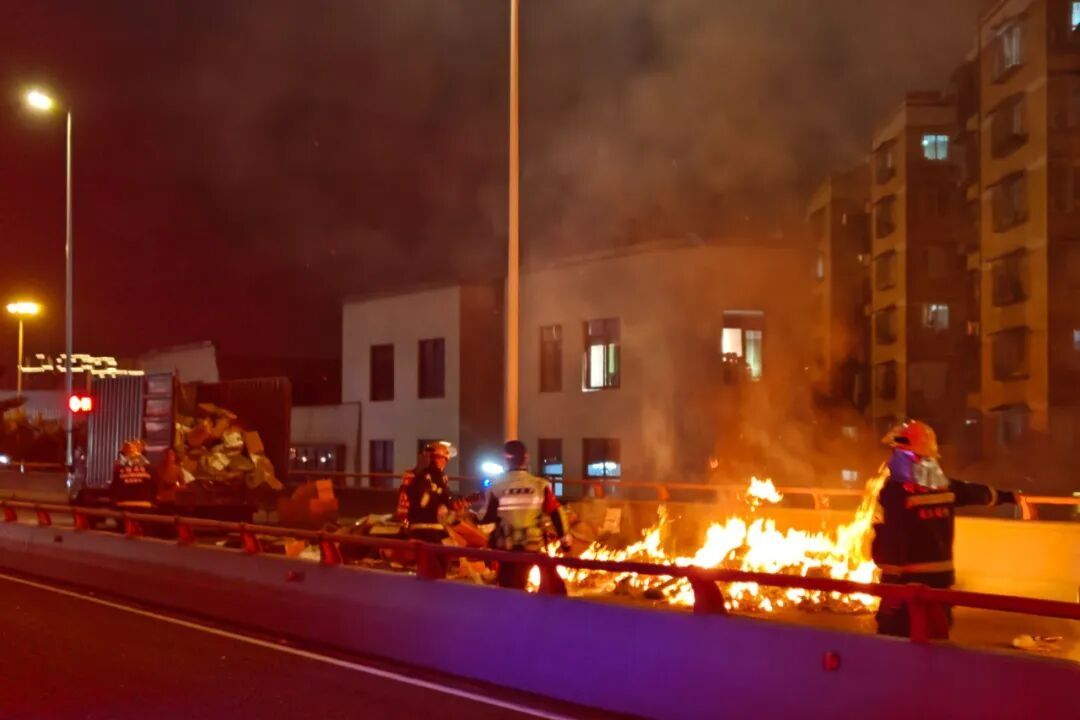 10月29日19时许,福州铁骑巡逻至岳峰高架桥时,发现前方一辆行驶中的大货车货物起火,现场情况危急。铁骑队员迅速将车辆拦停,第一时间上报情况并拨打119,同时使用随车灭火器尝试压制火势。
