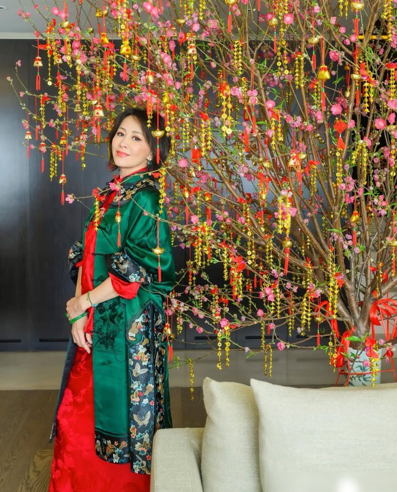 虽然在香港,但是该有的传统仪式一个不少,大年初一她穿着全红的传统服饰,戴着玉饰品,在自家两亿的独立复式豪宅大门前拜年。
