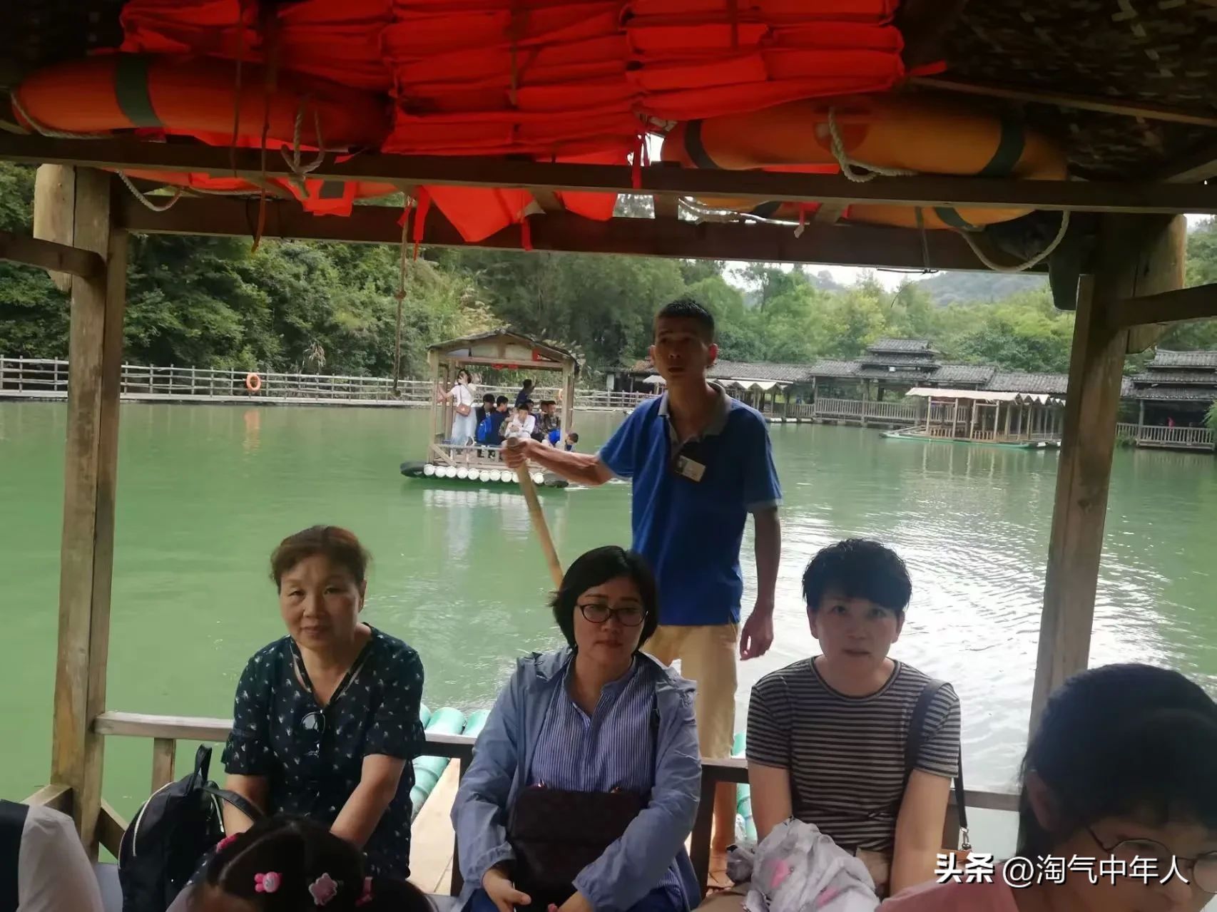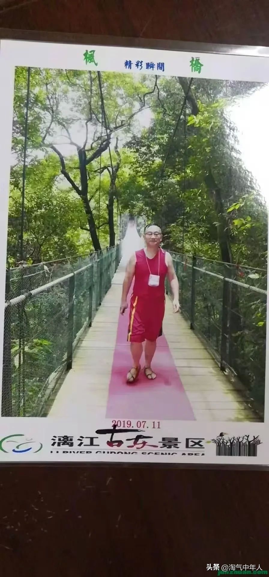 我随着几个游客,回抵岸后,游客要准备草鞋,头盔,换衣服到荐放处。我换上短袖衣裤,穿上草鞋,拍照留影。