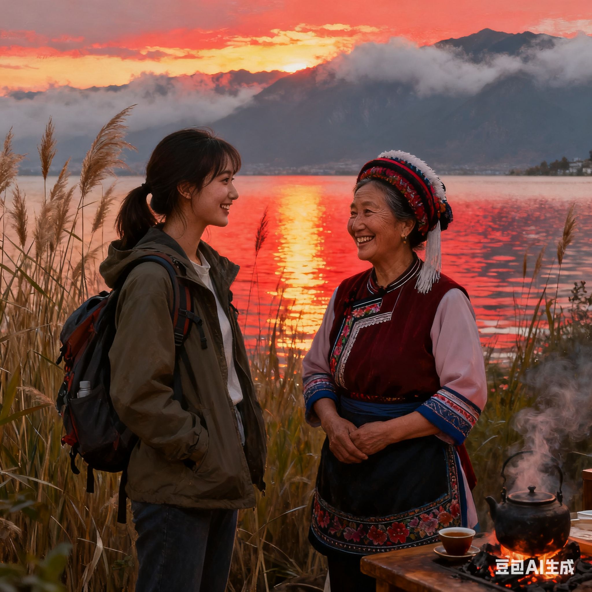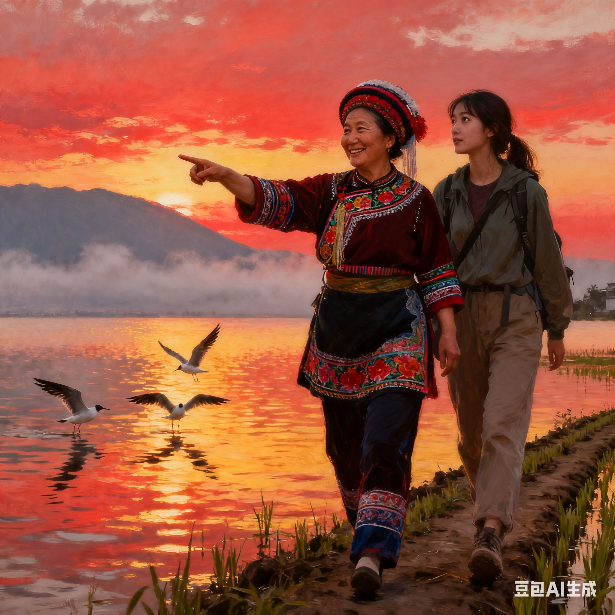 雨停时已近黄昏,阿姐说要带我去看“别人找不到的洱海”。我们沿着田埂走到湖边,晚霞把湖面染成金红色,远处的苍山裹着一层薄雾,几只水鸟贴着水面飞过。她指着湖边的芦苇丛说:“去年有对情侣在这里求婚,雨比今天还大,我们一群人帮着撑伞,倒成了最特别的见证。”