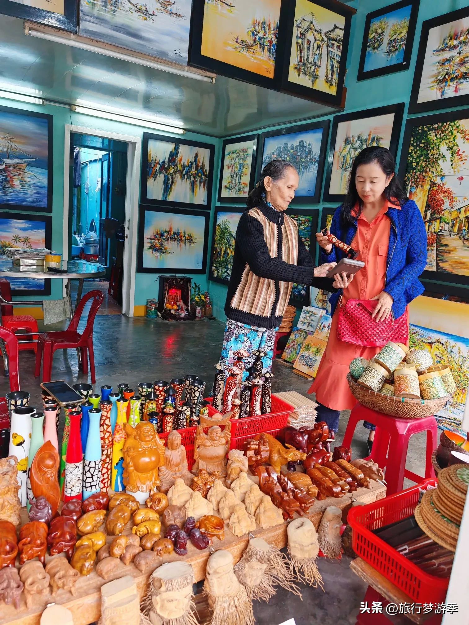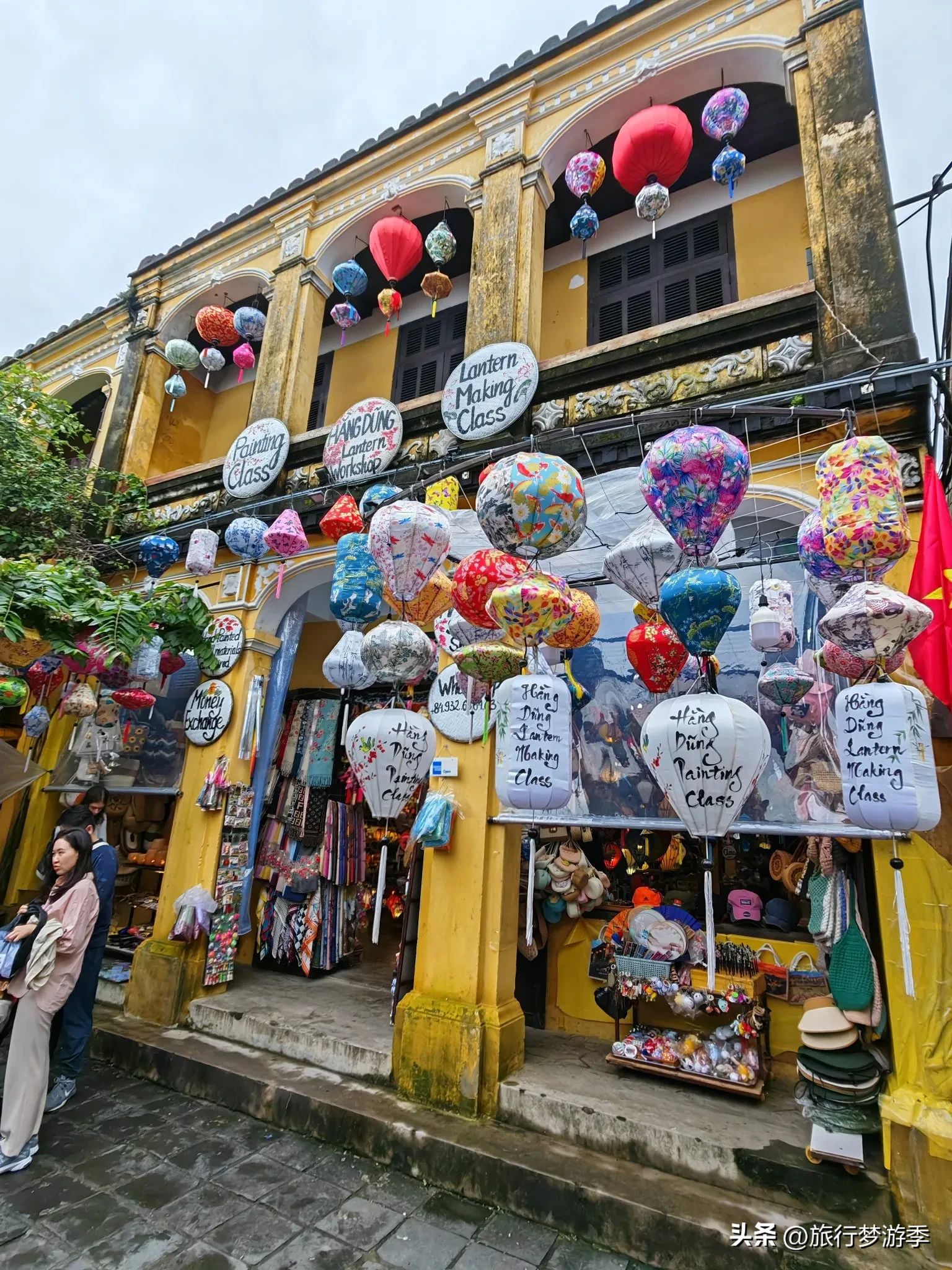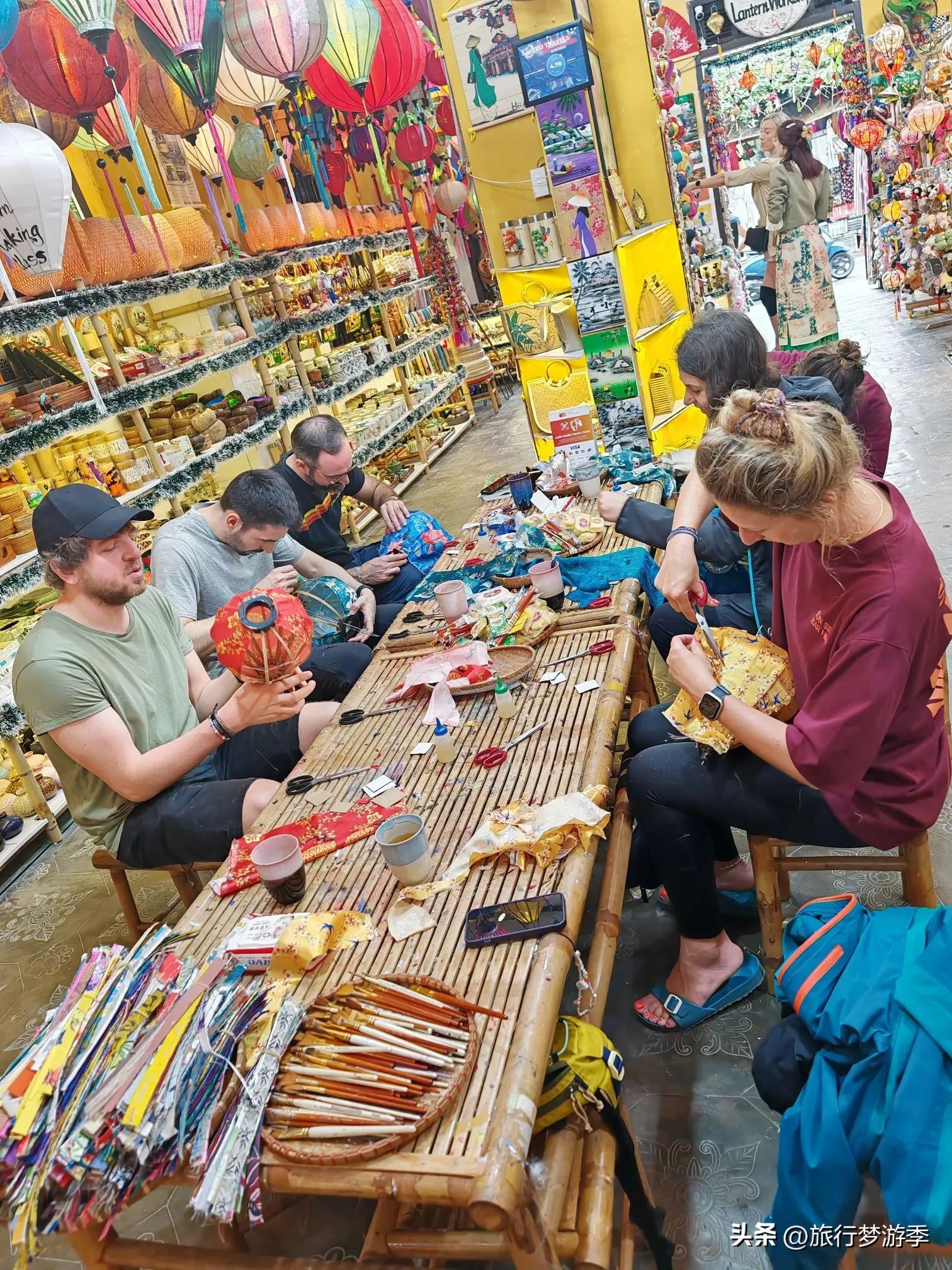 在会安古城的日本桥附近,偶然看到几个欧洲游客正兴致勃勃地学习加工灯笼。她们认真专注,眼神中满是好奇与热情,可动作却显得有些笨拙,手指在灯笼的框架间小心翼翼地摸索着,那副认真又略显笨拙的模样让人忍俊不禁。当她们注意到我投来的目光,抬起头与我相视一笑,眼中充满了对这份体验的新奇与满足。