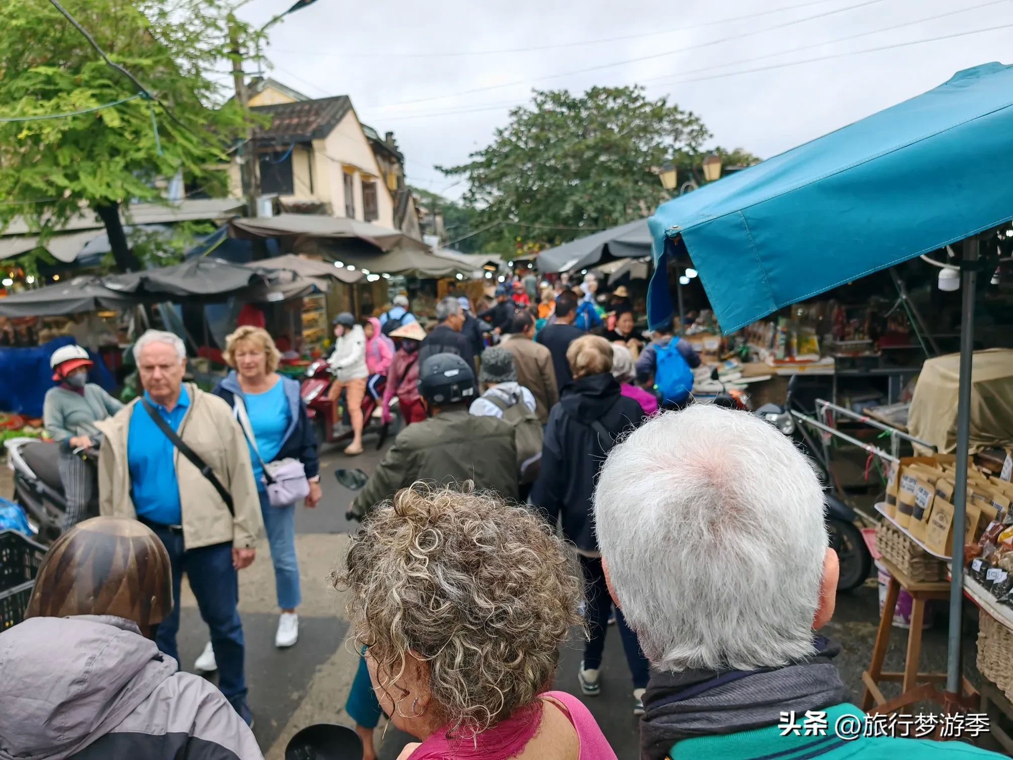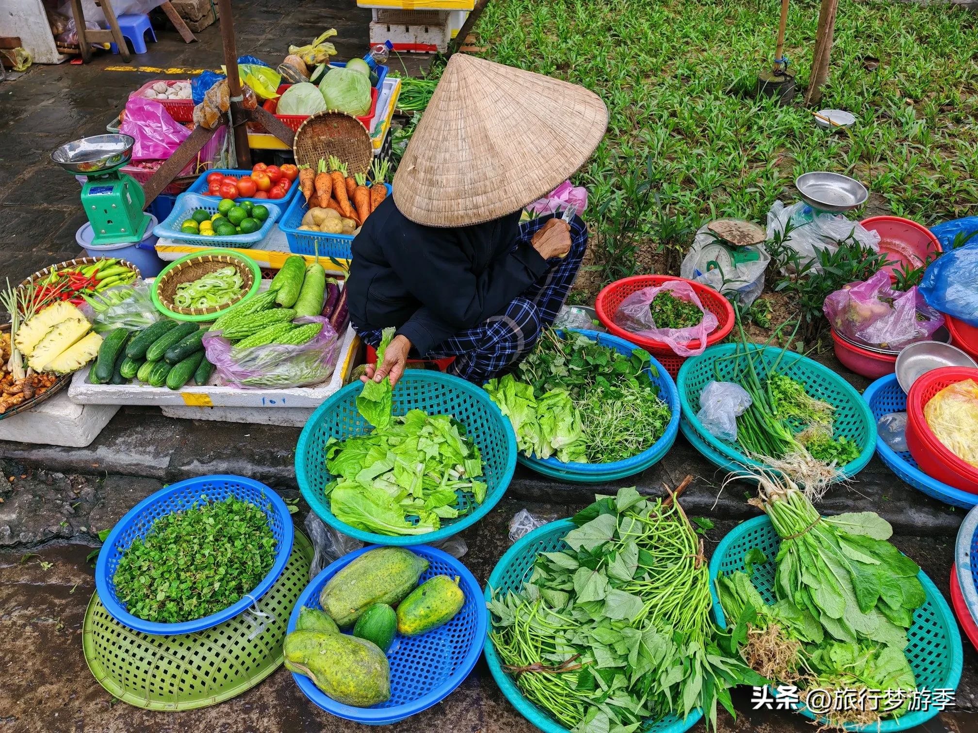 从日本桥继续往古城的河边走去,这里是一个热闹的菜市场。狭窄的小路上,摩托车、自行车与游客摩肩接踵。当地的居民骑着摩托车穿梭其中,车上装满了新鲜的蔬菜和各种生活物资。路边的摊位上,摆放着琳琅满目的水果、蔬菜和特色小吃。就在这时,我发现了一个有趣的现象,越南人上厕所要脱鞋换拖鞋如厕,费用是五千越南盾。这一独特的生活细节,也让我感受到了当地文化的独特之处。