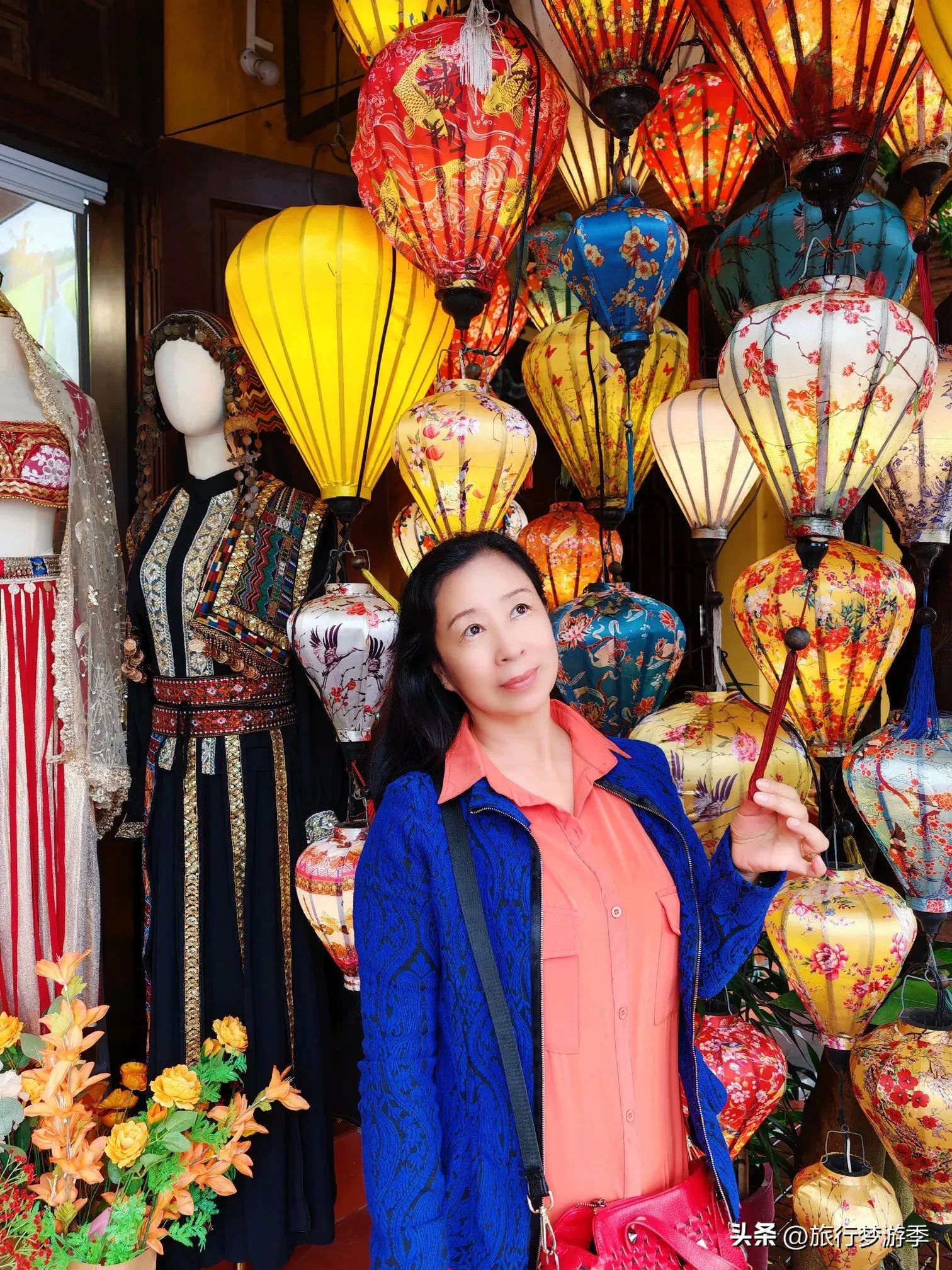 古色古香的建筑街道,宛如一位位历经沧桑的老者,静静诉说着往昔的故事。墙壁上斑驳的痕迹,是岁月留下的独特印记。街道两旁林立着各种店铺,琳琅满目,摆满了令人眼花缭乱的纪念品和土特产。其中,会安的灯笼尤为瞩目,一盏盏精致的灯笼,在微风中轻轻摇曳,散发着温暖而柔和的光芒,为这座古城增添了一抹浪漫的色彩。奥黛,作为越南传统服饰,以其优雅的剪裁和独特的设计,展现出越南女性的柔美与风情,成为会安一道亮丽的风景线。
