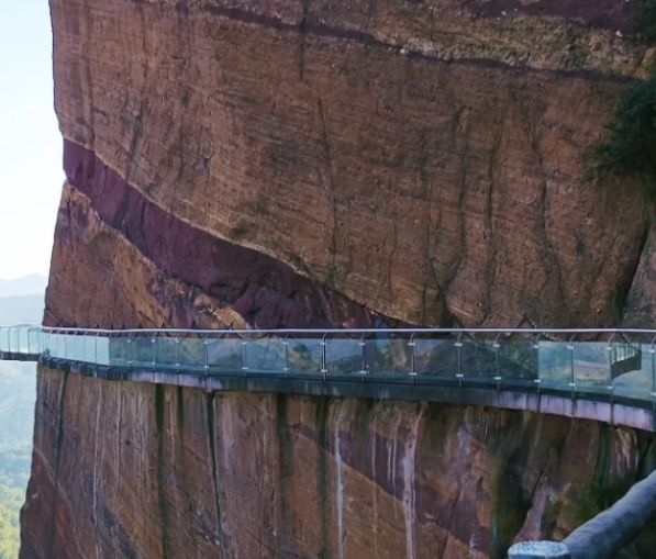 当现代游览设施遇上古老地质奇观,悬空玻璃栈道成为必打卡的"心跳体验"。这条沿丹霞赤壁修建的观景长廊,脚下是百米深渊,眼前是万峰竞秀,云雾翻涌时仿佛漫步天宫。