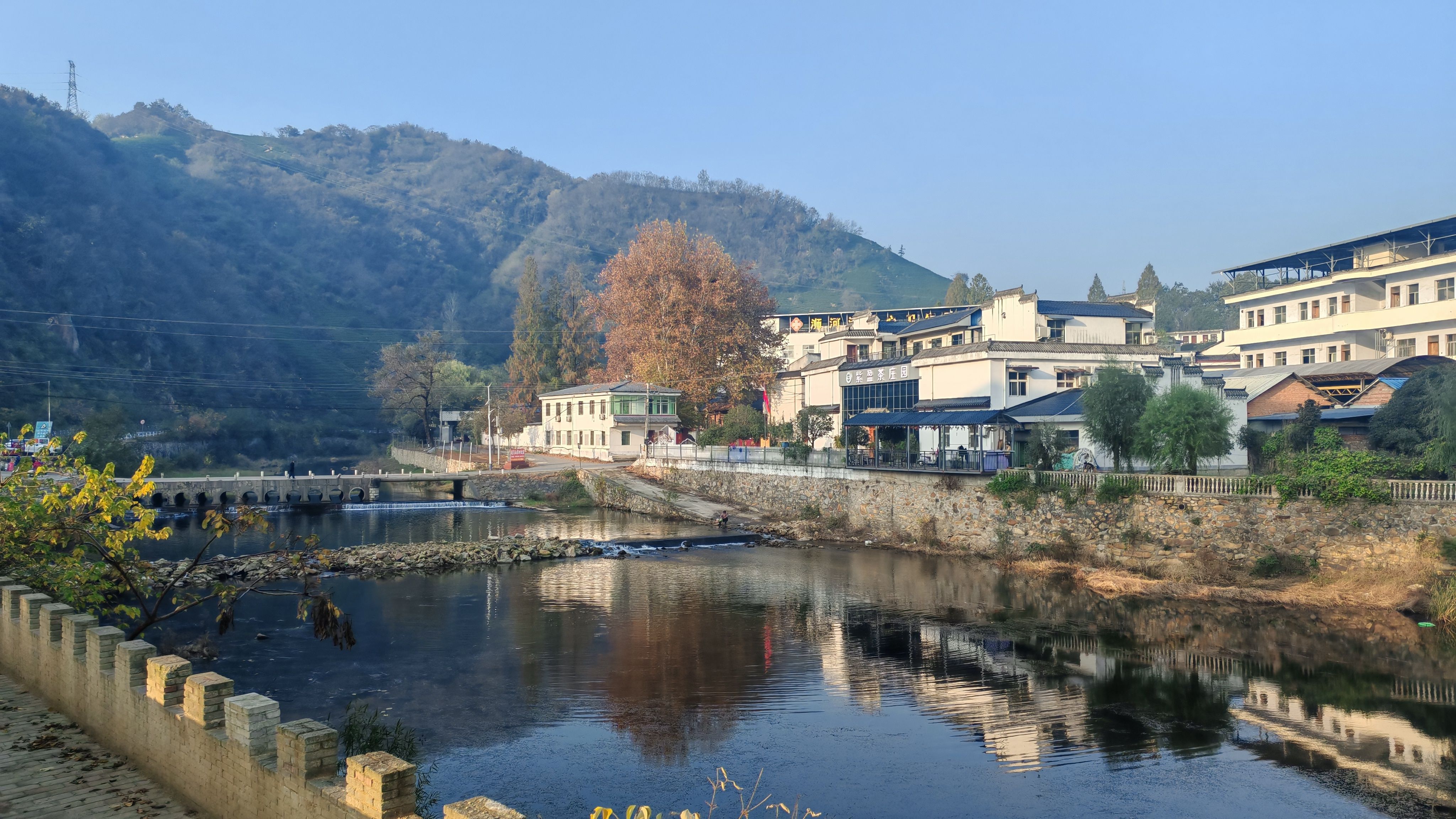 秋天的信阳,是上帝打翻的调色盘:四望山的茶畦是沉稳的翠绿,点缀其间的,是乌桕、枫香燃烧般的赤金与赭红。