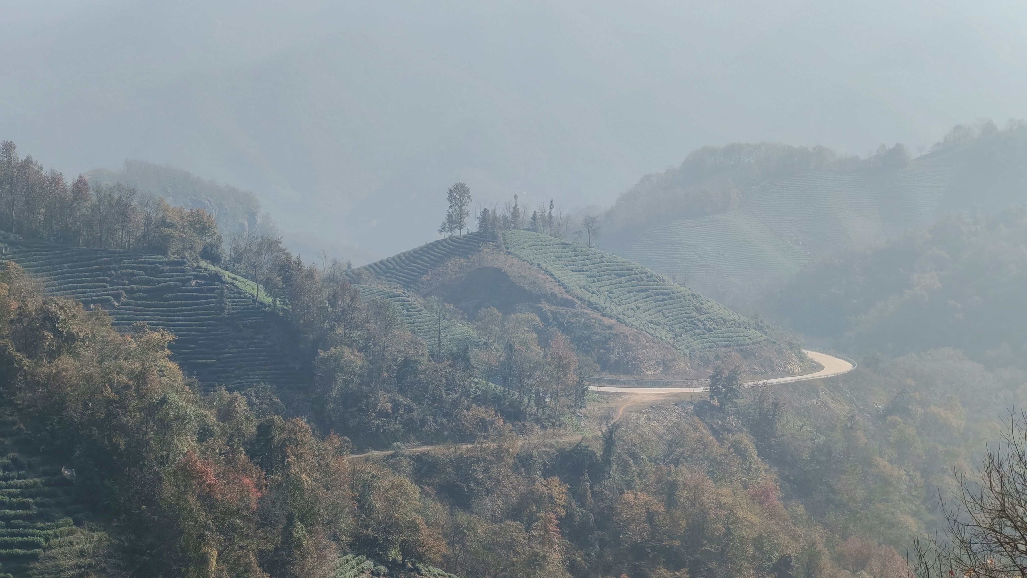 秋岚氤氲漫四望,为群山披上了一层柔和的滤镜。秋日的阳光醇厚柔润,将茶垄切割成明暗交错的琴键。