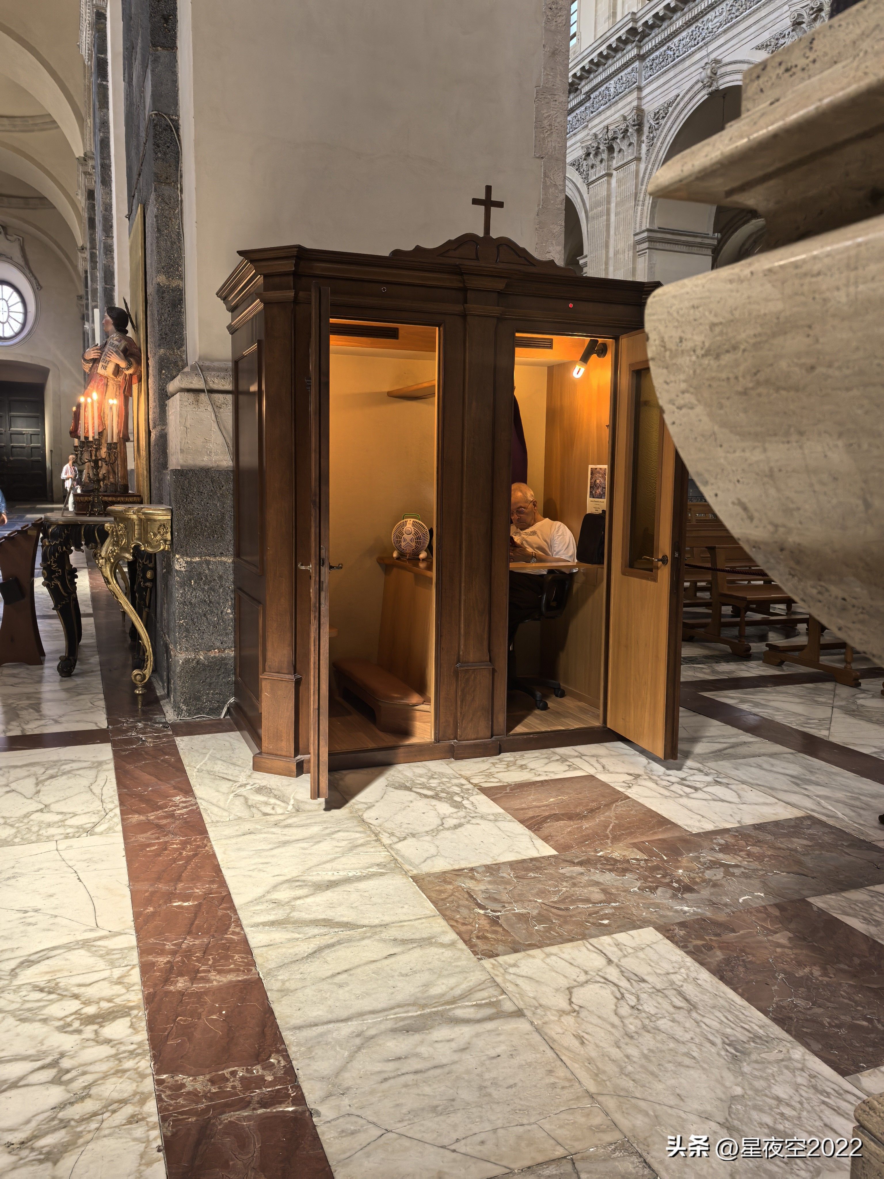 这是教堂内的告解室,见图6,或忏悔室。由两个并排的房间组成。一位牧师或神父,似乎在等待着忏悔者。两个房间之间用有遮蔽的窗户隔开,双方可以通话,却看不见对方。