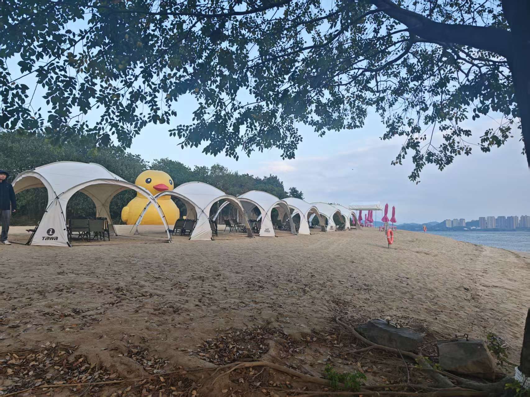 因为要追访第三美,就匆匆结束了法治廉政公园的游程。往福州方向略行一公里,从一斜坡径直而下,我们便闯入了私人的营地,下车后,便有小妹上前问询。我们说过来探访的,她也不恼,带我们参观整个营地。里面的棒球场还在施工中,可以看出场地巨大。来到江边,我们就看到对岸看过来的白色帐篷和黄色巨鸭了。因为没有对外宣传,游客极少,可以看出这一带江面风景极好,又处于看夕阳的绝佳位置。