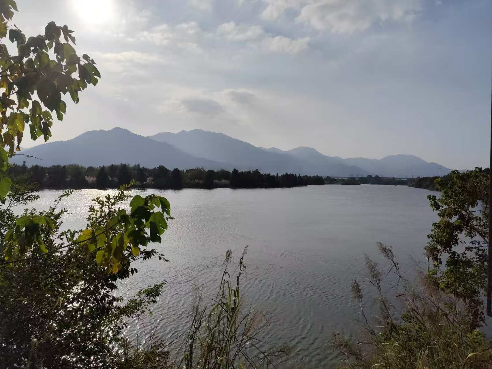 此行最大的收获在涤心路上,这是一条石头垒出的江堤,堤下的绿植已经密布,有龙眼、橄榄也有香蕉、木瓜,最奇异的是岸边的芦苇,花开粉色,远看过去,像一丛丛的粉黛子草。江堤上再看对岸的青山,美极了!夕阳下的山分青色、绿色、深绿色。阳光刺破云层,洒在山梁上,如万箭齐发般地壮观。