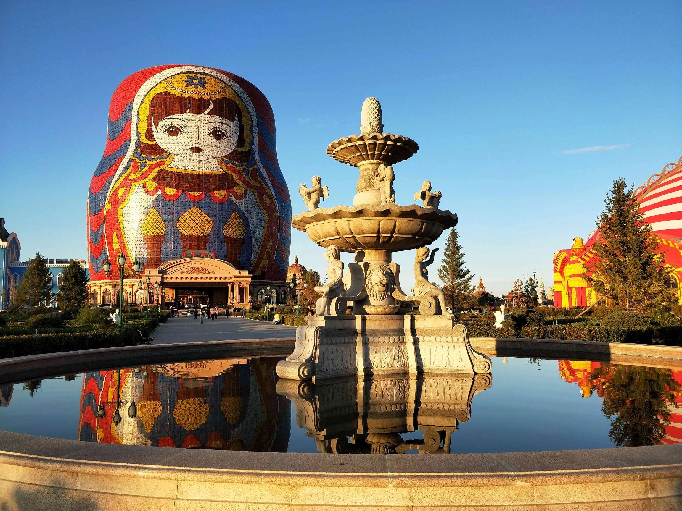 - 满洲里套娃广场:中俄蒙三国风情碰撞地,糖果色建筑群里藏着超萌巨型套娃,夜景灯光亮起秒变童话镇,周边还有国门景区,可以登上国门观景台远眺俄罗斯小镇。