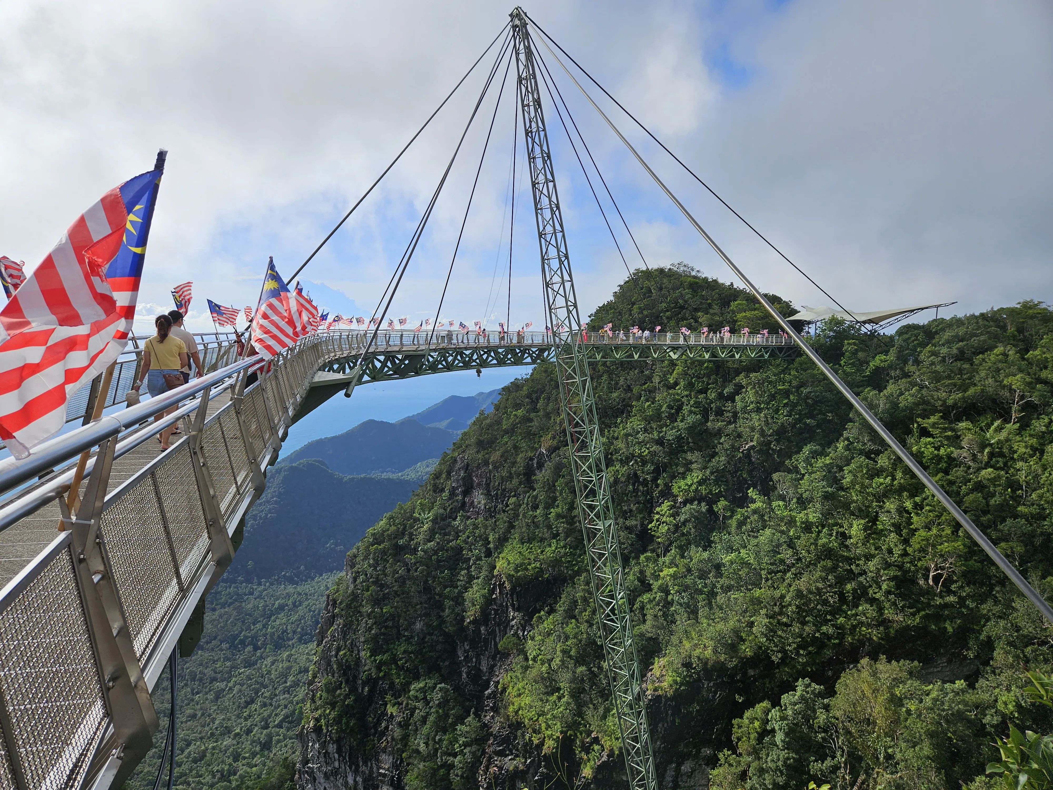 午餐结束,驱车去民宿,5分钟就到了。门口密码箱拿了钥匙,开门自行入住。这是套3房2厅2卫的公寓,基本设施都有,卫生状况也很好,600元一晚上,觉得性价比不错。由于昨天的红眼航班,都没休息好,所以下午我们都睡了一觉。3点多,我们出发去了兰卡威第一个景点,“天空之桥”。景点门票是80马币,含来回缆车费用。缆车15分钟后到第一观景点,可以俯瞰整个兰卡威的碧海蓝天。旁边就是“天空之桥”,看起来还是挺震撼的,整个桥体横跨两座山峰,就靠一根钢梁支撑起6条钢索,力学方面用到极致。对于我们造桥大国来说,这技术难度不大。但放在上世纪90年代的时候,能建成该桥,可见马来西亚当时的科技水平还是比较领先的!