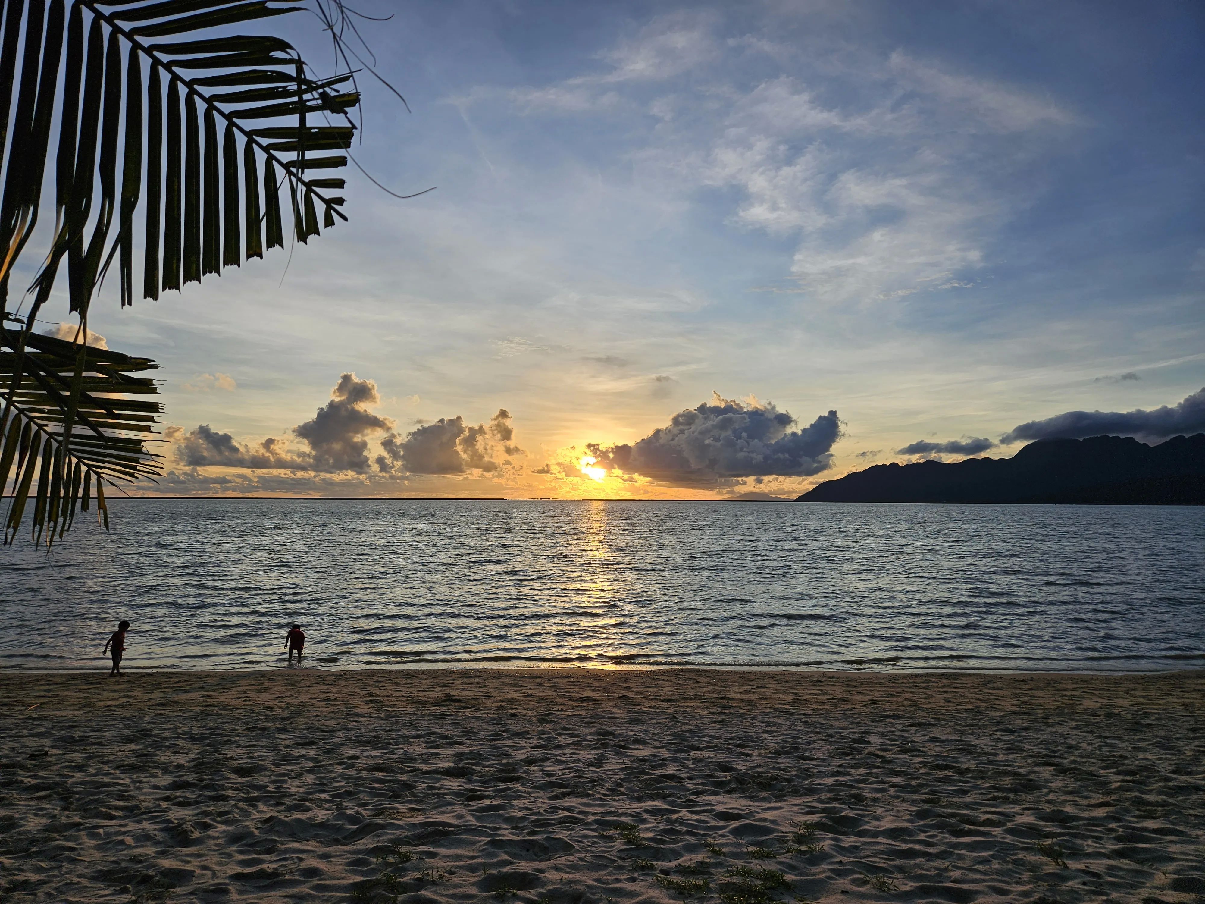 游完“天空之桥”,经过一海滩,路边停了好多车子,都在不远处沙滩上看日落。我们也停下车走到海滩。远处海平面上,看到太阳徐徐落下,一抹金色余晖洒在海面上,岸边椰树婆娑,此情此景,想起了一句诗,“夕阳美如画,清风醉晚霞“!