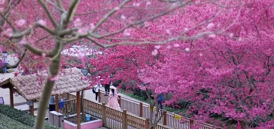 永福镇的樱花茶园被誉为“中国最美樱花圣地”,10万株樱花在5万亩茶园中次第开放。1月末至3月,绯红的樱花与翠绿的茶树形成强烈对比,登上台品樱花茶园的观景台,可俯瞰粉红波浪起伏的壮丽景色。