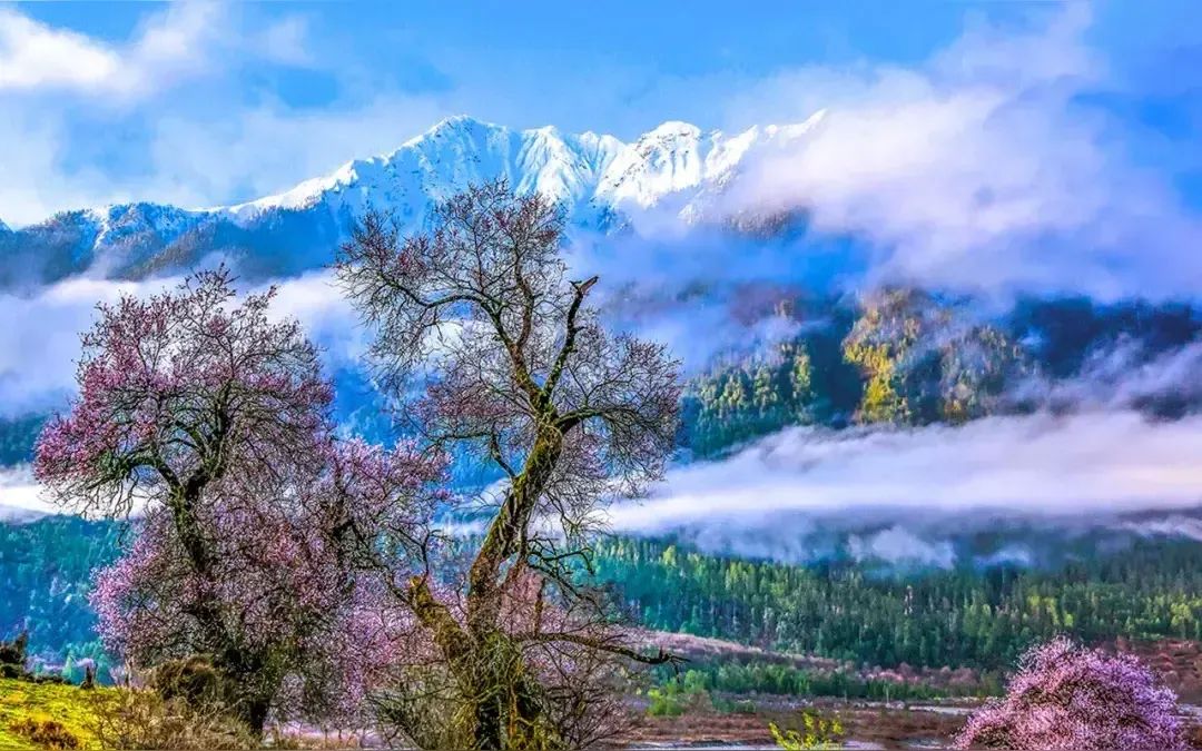 3月的林芝,寒意未退,但桃花已如粉霞般铺满山谷。这里的桃花多为野生,树干苍劲,花朵繁密,与远处的雪山、碧绿的青稃江构成一幅“雪域江南”的画卷。波密桃花沟坐拥十万株野生桃树,绵延30公里,而**雅鲁藏布江大峡谷**的桃花则镶嵌在陡峭的峡谷间,日落时分还能邂逅南迦巴瓦峰的“日照金山”。