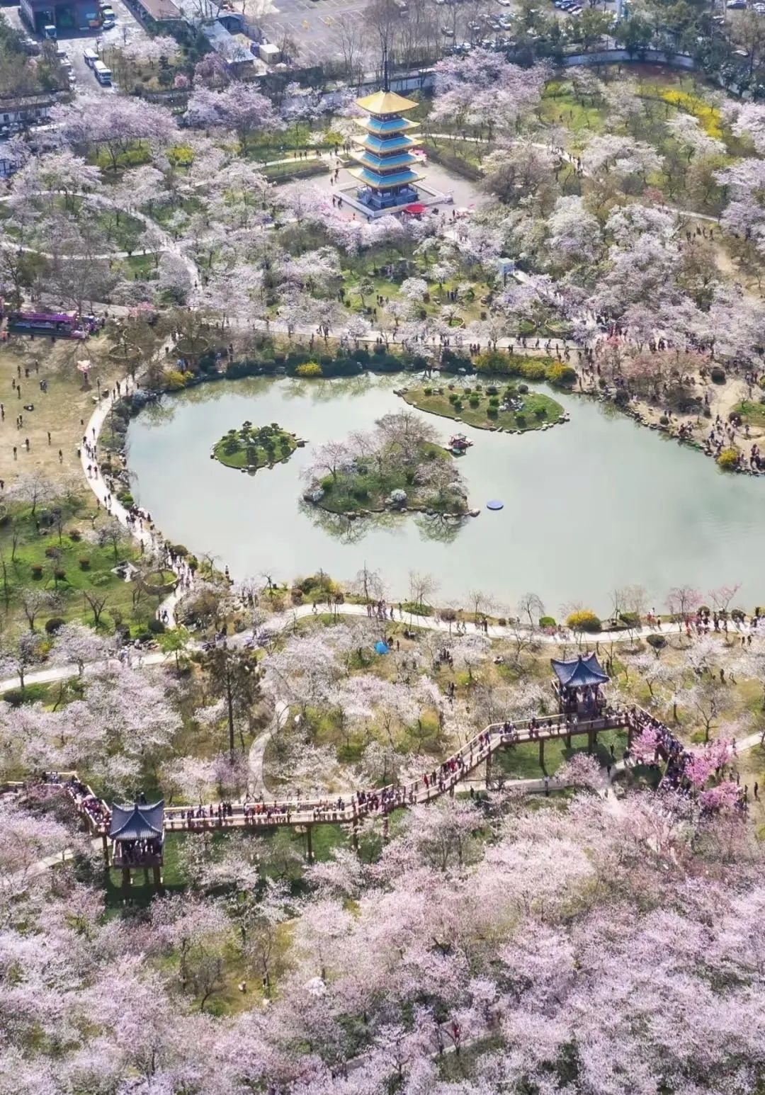 东湖磨山樱花园与日本弘前、美国华盛顿齐名,3月盛放时,60多个品种的樱花如云霞蔽日。夜晚的灯光秀更让樱花多了几分梦幻,漫步五重塔下,落樱随风轻舞,恍若穿越至京都。