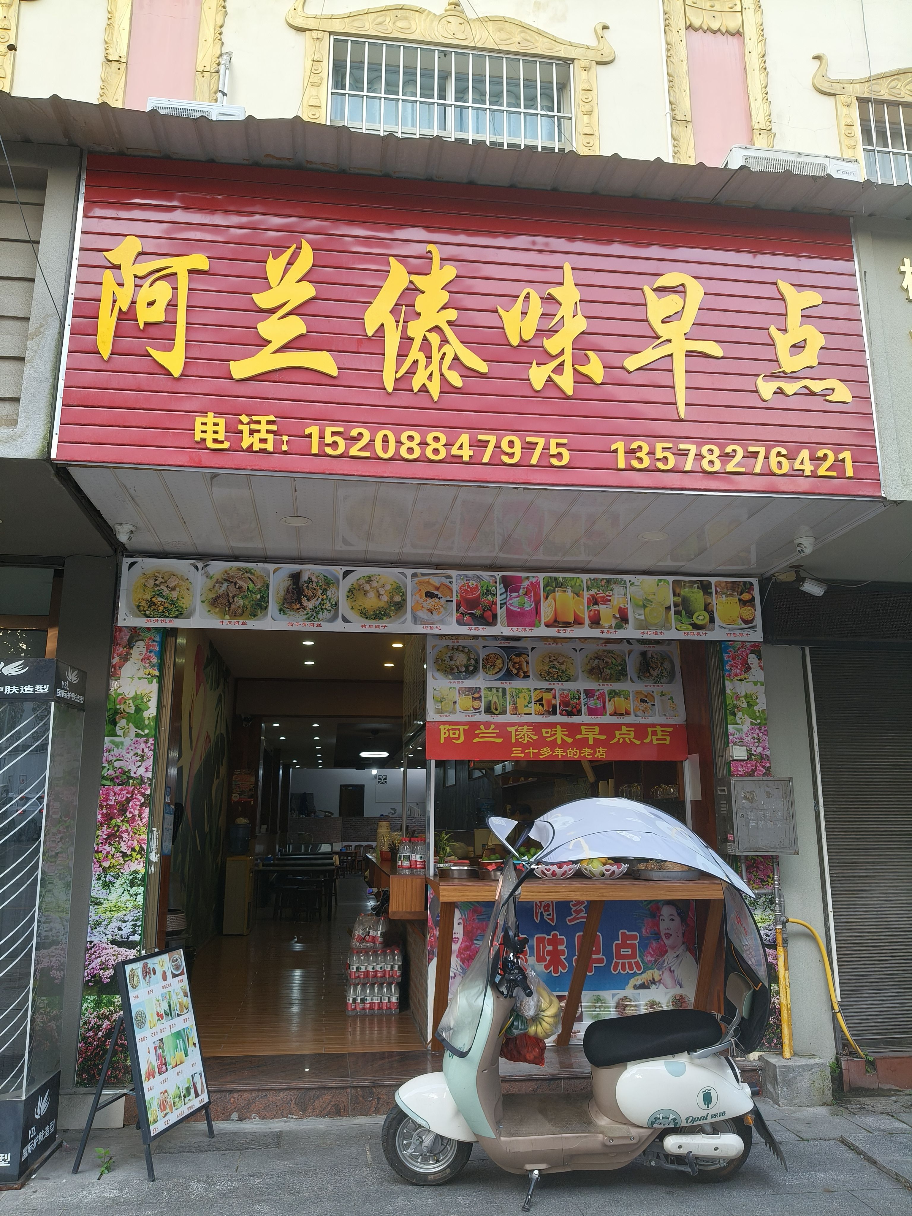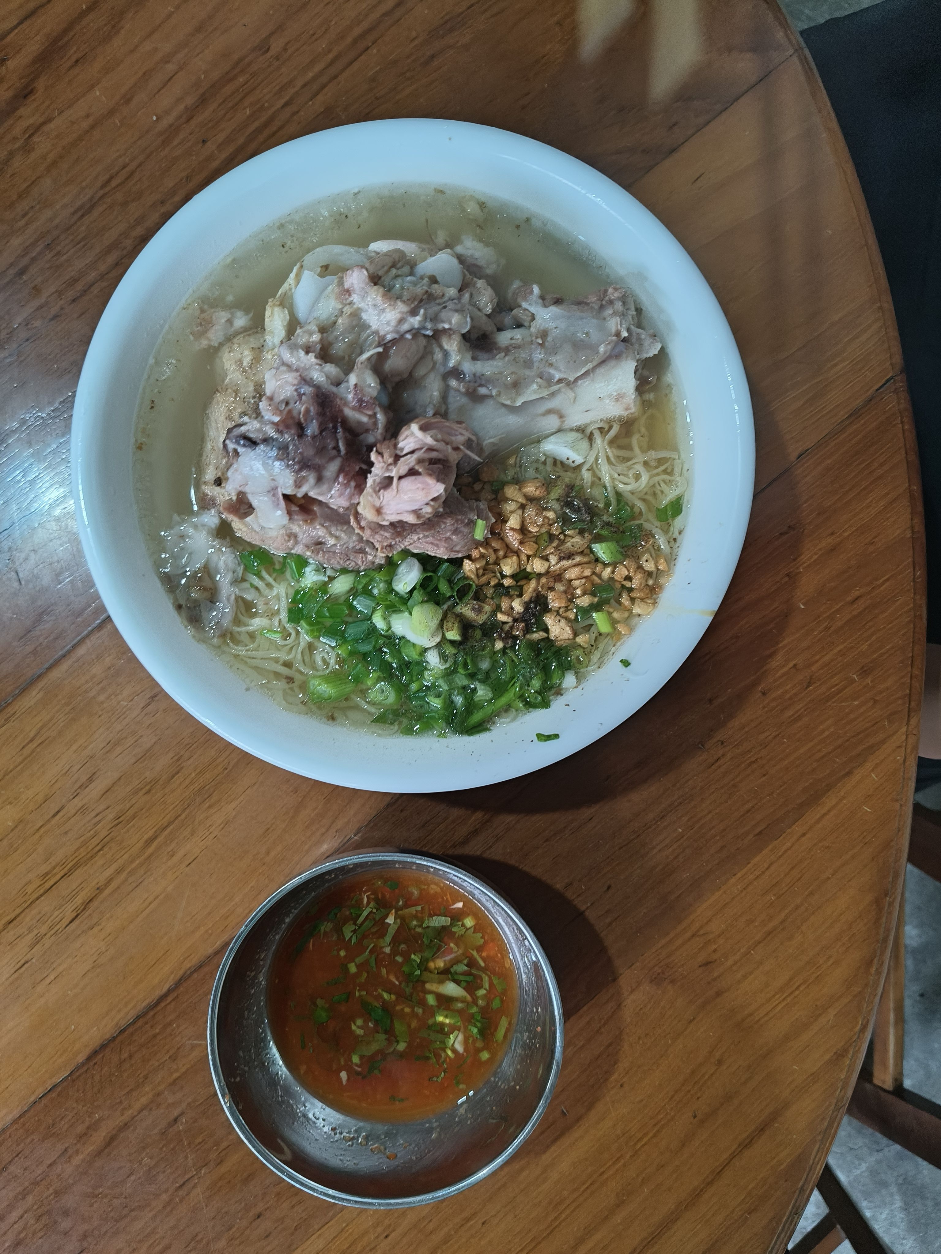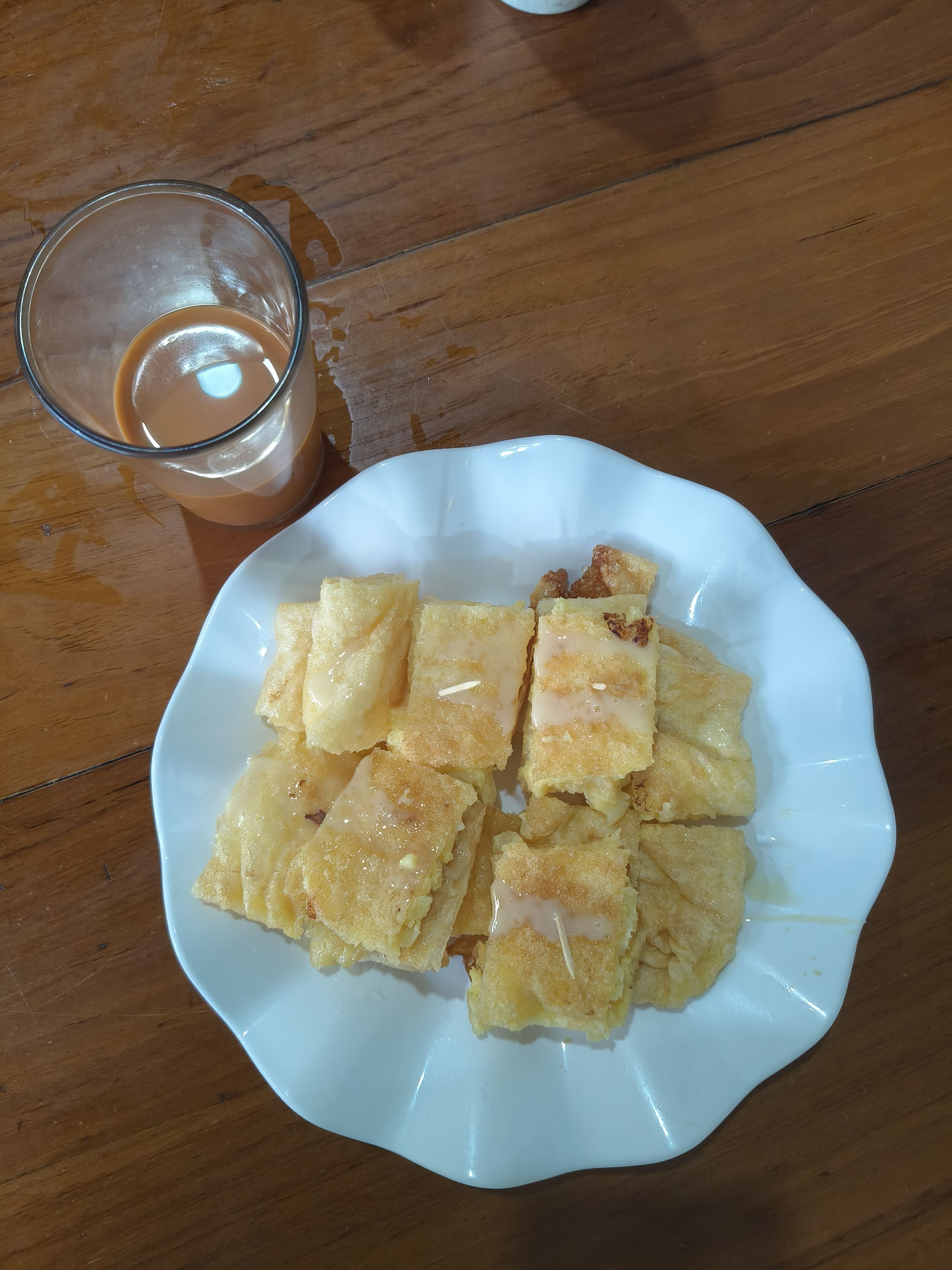 网上攻略到“阿兰傣味早点”,早餐就定位在那里了。8点没到进瑞丽市,街上还没多少人。顺利找到早点铺,我和先生各点自己的早餐,我的是菠萝粑粑和奶茶,先生点了筒子骨面,又加了两杯咖啡。奶茶和咖啡都加炼乳,有点甜,但也能接受,另一种味道吧。