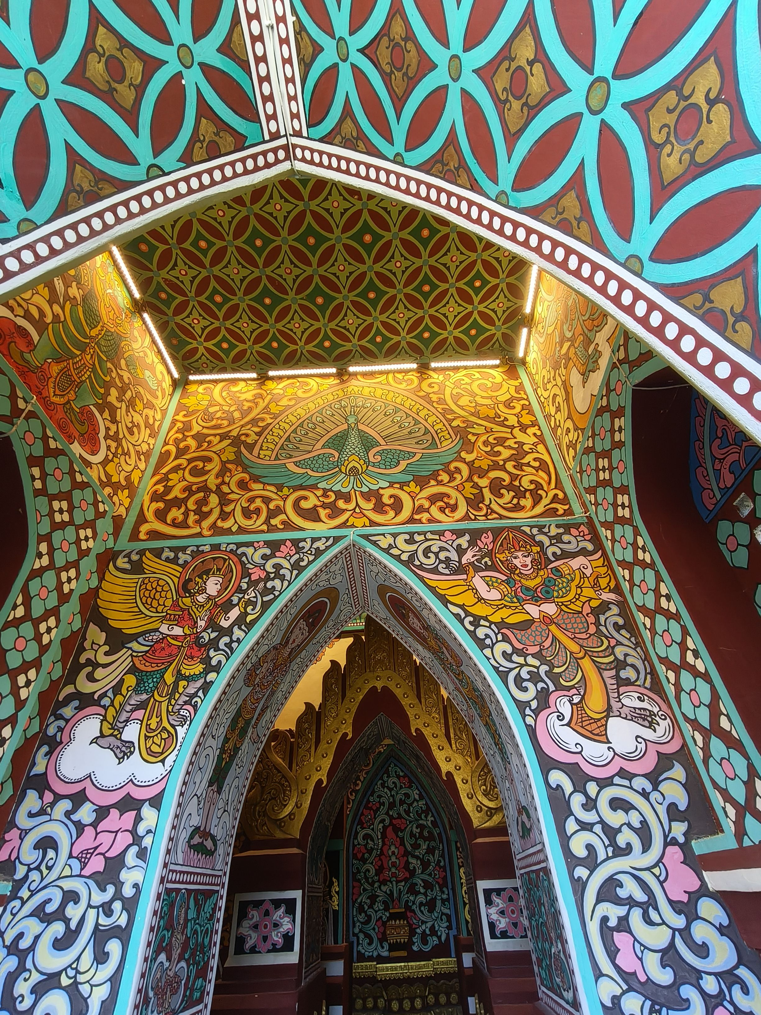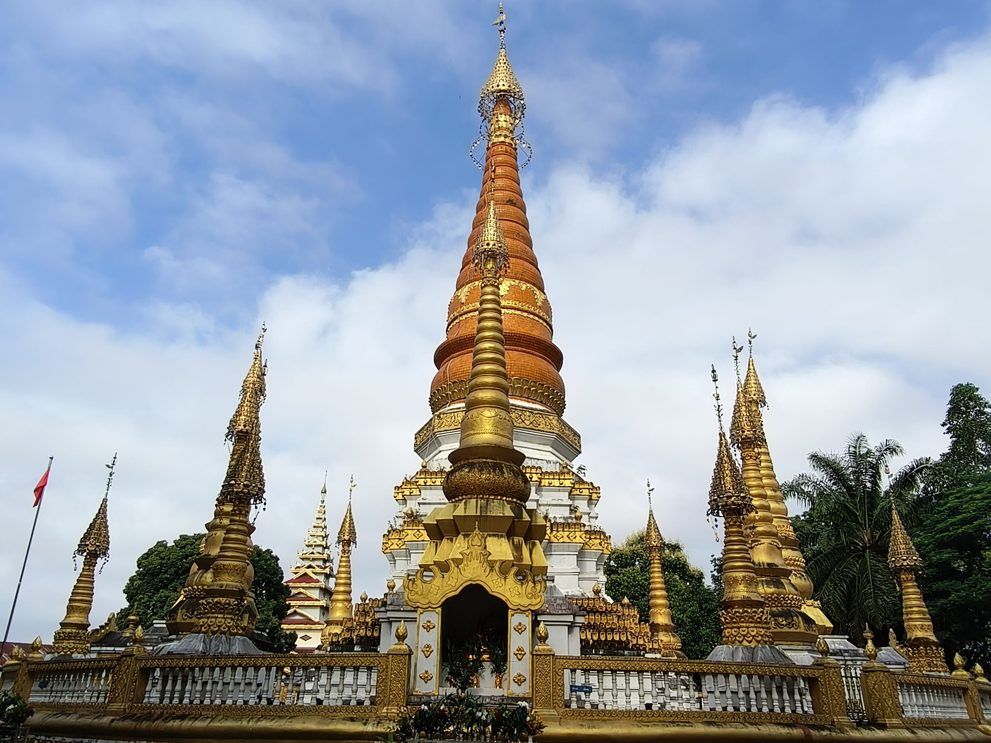 早餐后去姐勒大金塔参拜。因为时间尚早,人少安静。有几位穿民族服装的信徒们在佛像前献净水、鲜花等,非常虔诚的膜拜。学着他们我俩也脱鞋光脚游拜寺院内。姐勒大金塔是云南省德宏傣族景颇族自治州瑞丽市最著名的佛教圣地之一,也是东南亚重要的佛塔之一。