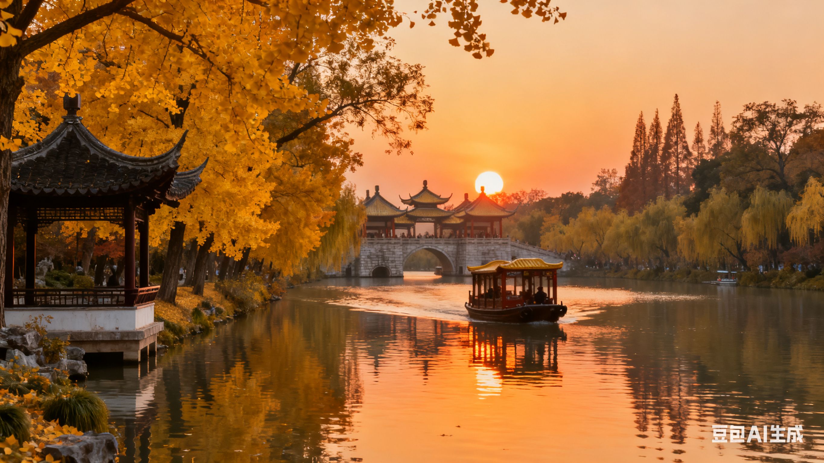 瘦西湖的银杏则多了几分雅致,沿湖岸蜿蜒的银杏道,与湖水、拱桥、亭台相映成趣。泛舟湖上,看两岸金叶倒映在碧波中,船桨轻摇,仿佛驶入了鎏金的梦境。待到傍晚,夕阳为银杏镀上一层暖橙,与瘦西湖的夜景交相辉映,美到让人舍不得离开。