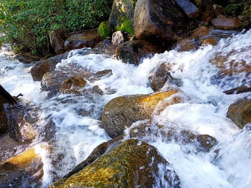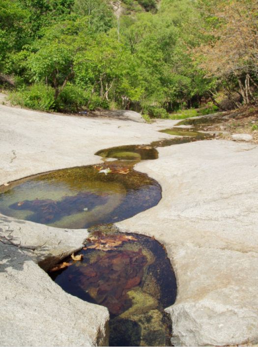 尽享天然“空调”后,仅需20多分钟车程,即可抵达苗营村北的驼峰沟内的秘境——七仙盆自然景观。这里有一块饱经雨水冲刷的巨型岩壁,光滑如镜的表面上,七个天然石盆错落分布,常年蓄满清泉,宛如仙人的浴池。泉水叮咚、苔藓覆石,未开发的原始风貌让这里格外幽静。最重要的是,全程免费!