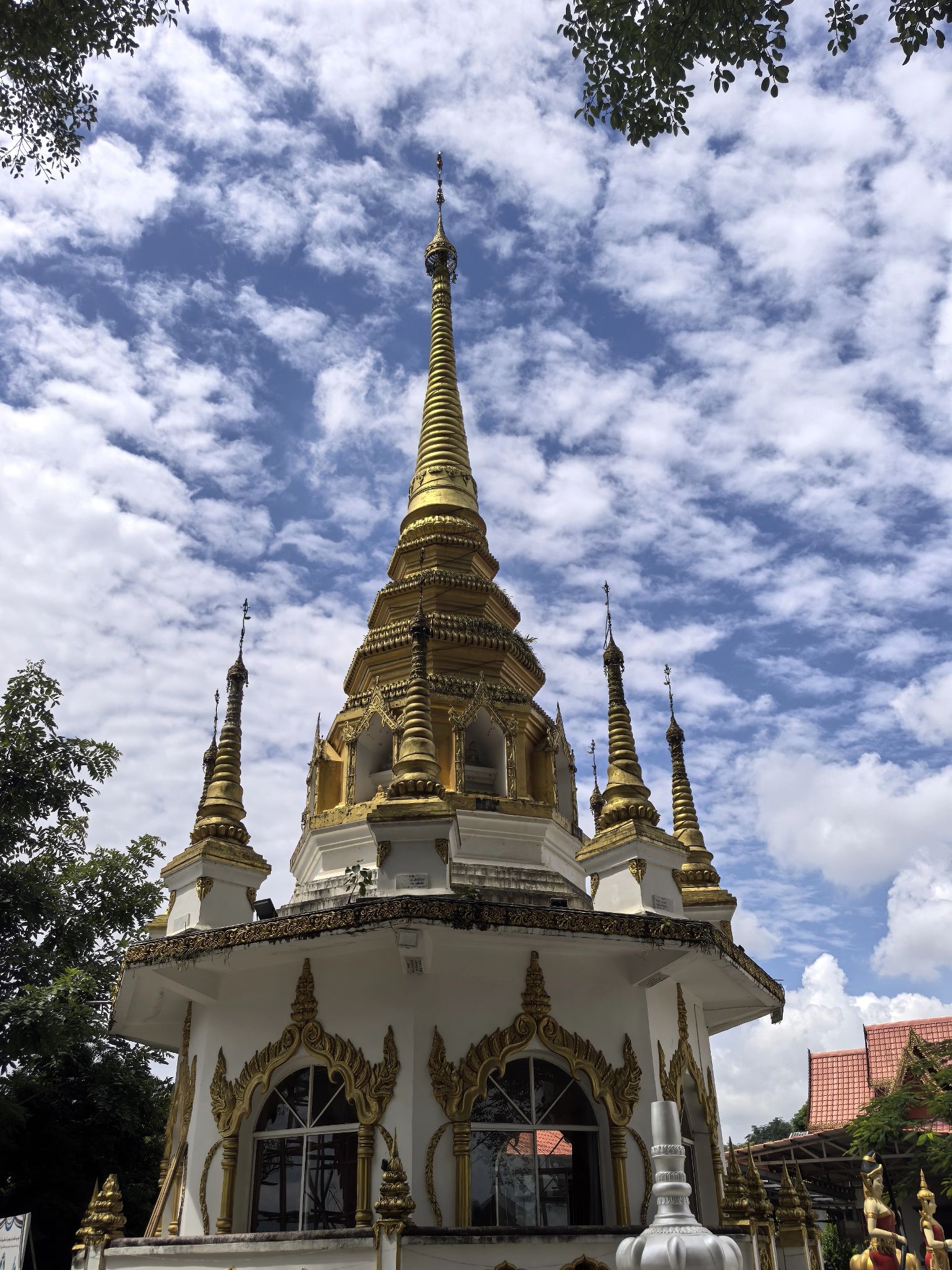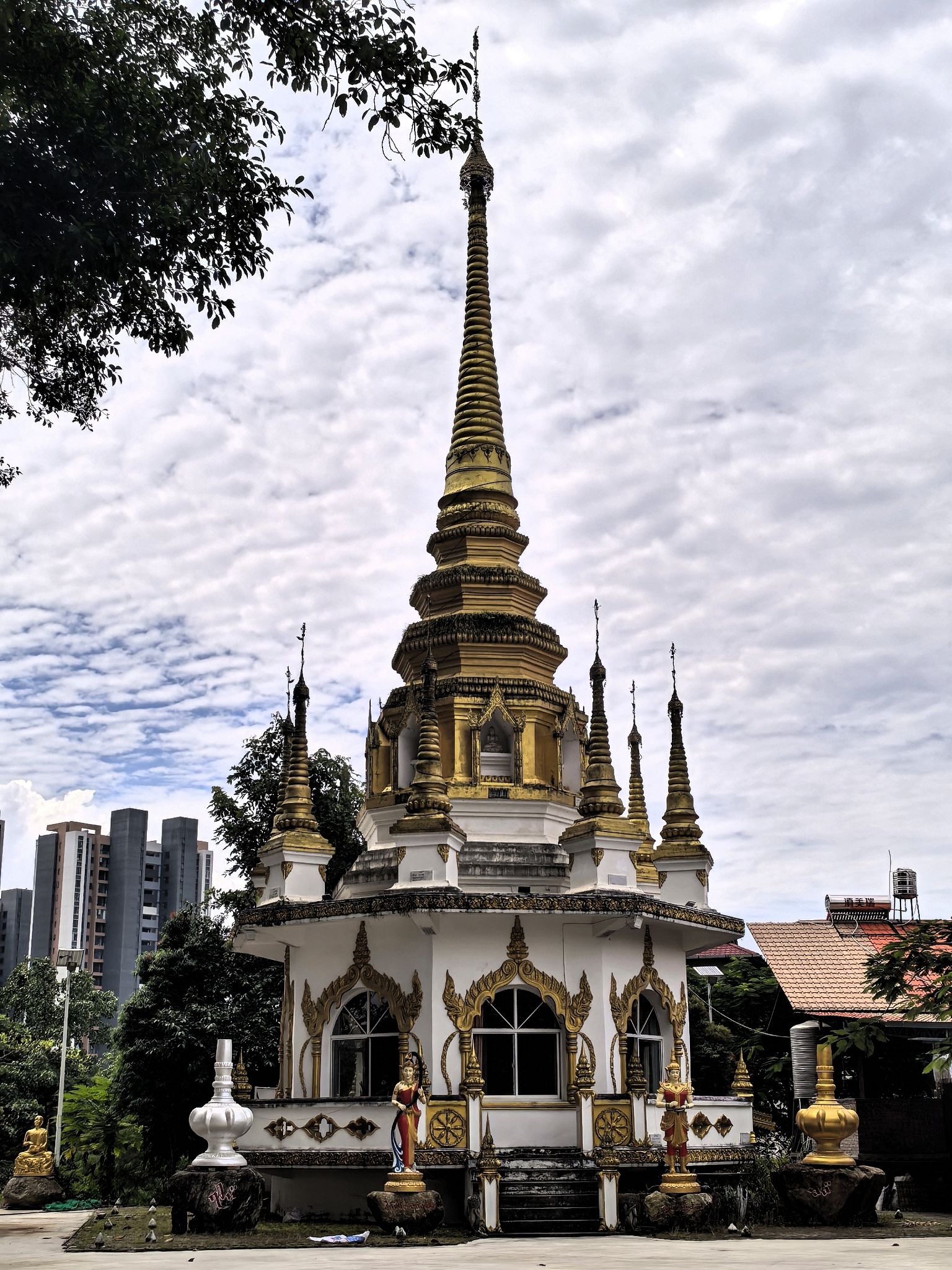 奘寺与竹编大佛:旁边有一座外观普通的奘寺,寺内有国内最大的竹编大佛。此佛高约5米、宽约3米,呈现出释迦牟尼念经打坐的神态,自然逼真、栩栩如生。该佛像是由缅籍华人、傣族民间艺人弄恩相耗时一个月编制而成。也有说法称佛像高9.3米,身披金光闪闪的袈裟,面带微笑,慈祥可亲,其前方常摆放着鲜花。