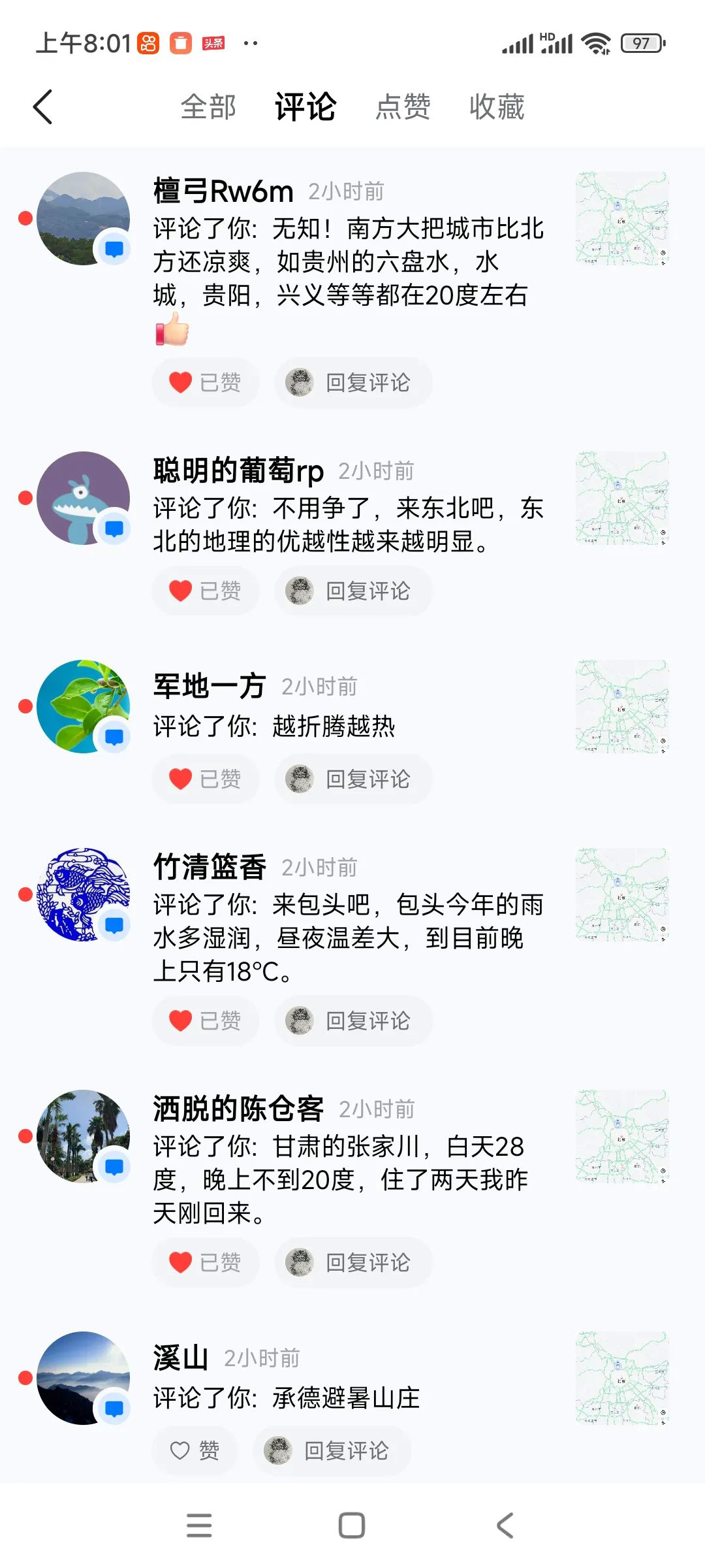 我上篇的内容,确实说到不考虑南方,只考虑北方,因为南方大部分城市还是闷热酷暑难耐,我确实考虑不周,有朋友提到了云南昆明,曲靖,贵州六盘水,安顺,湖北恩施,神农架,福建厦门鼓浪屿,还有很多朋友发来来当地的气温截图,我犹豫了。