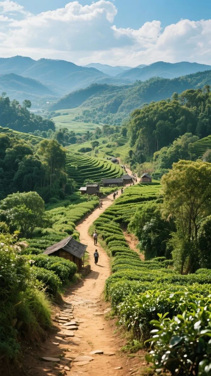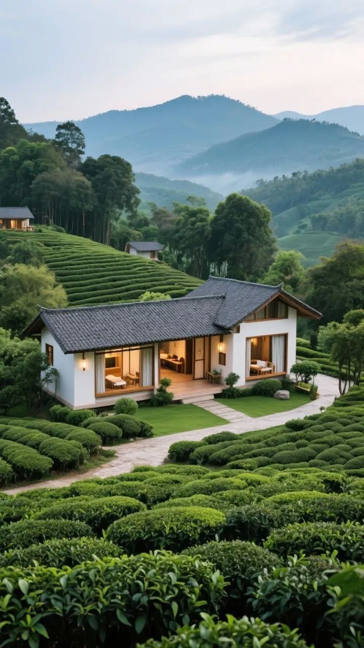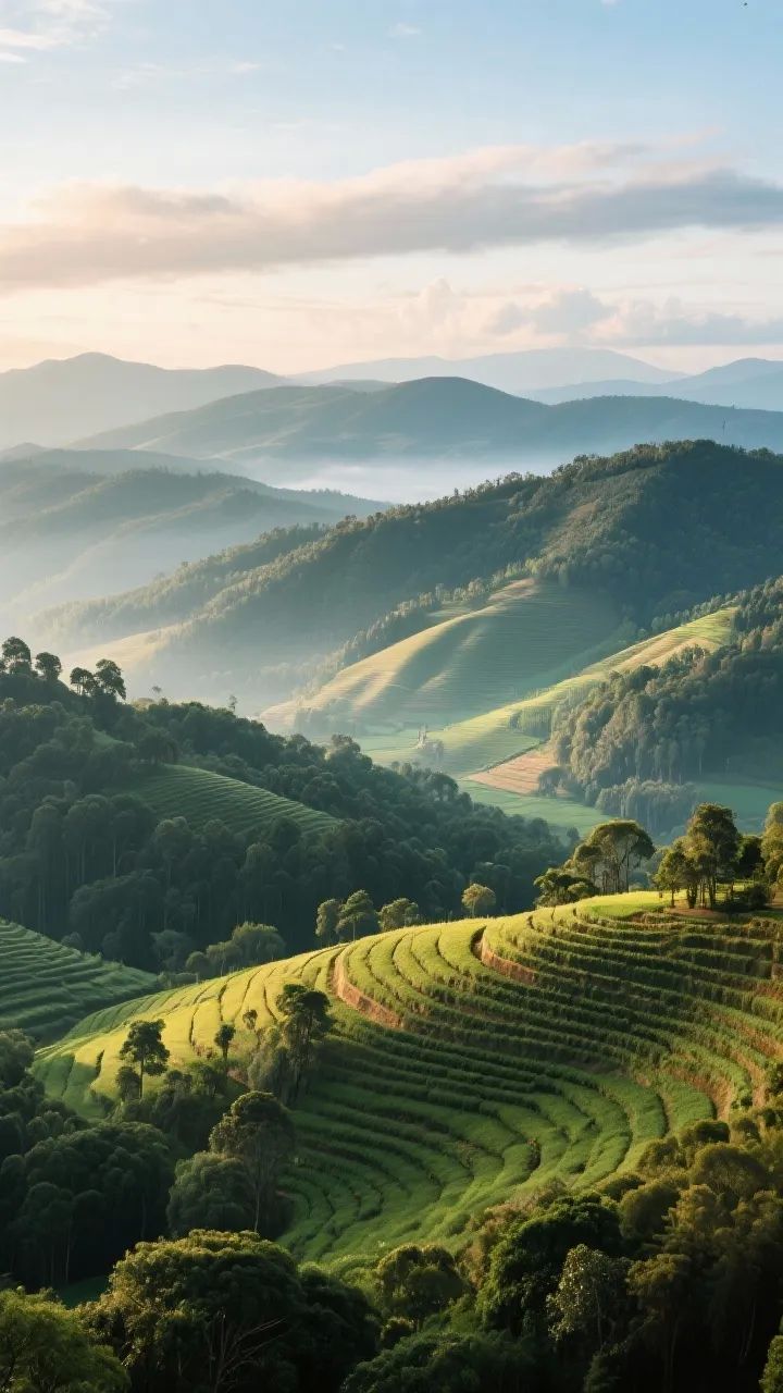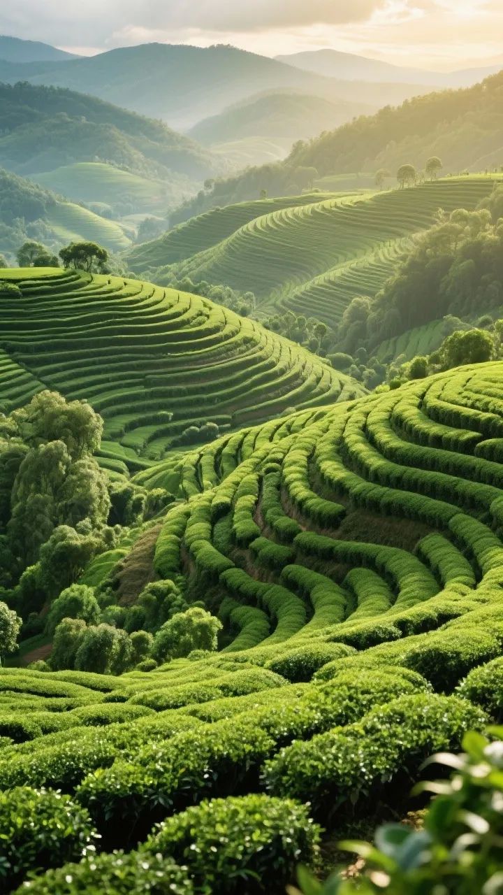 - **万亩茶园梯田**:清晨薄雾中航拍,如绿色指纹