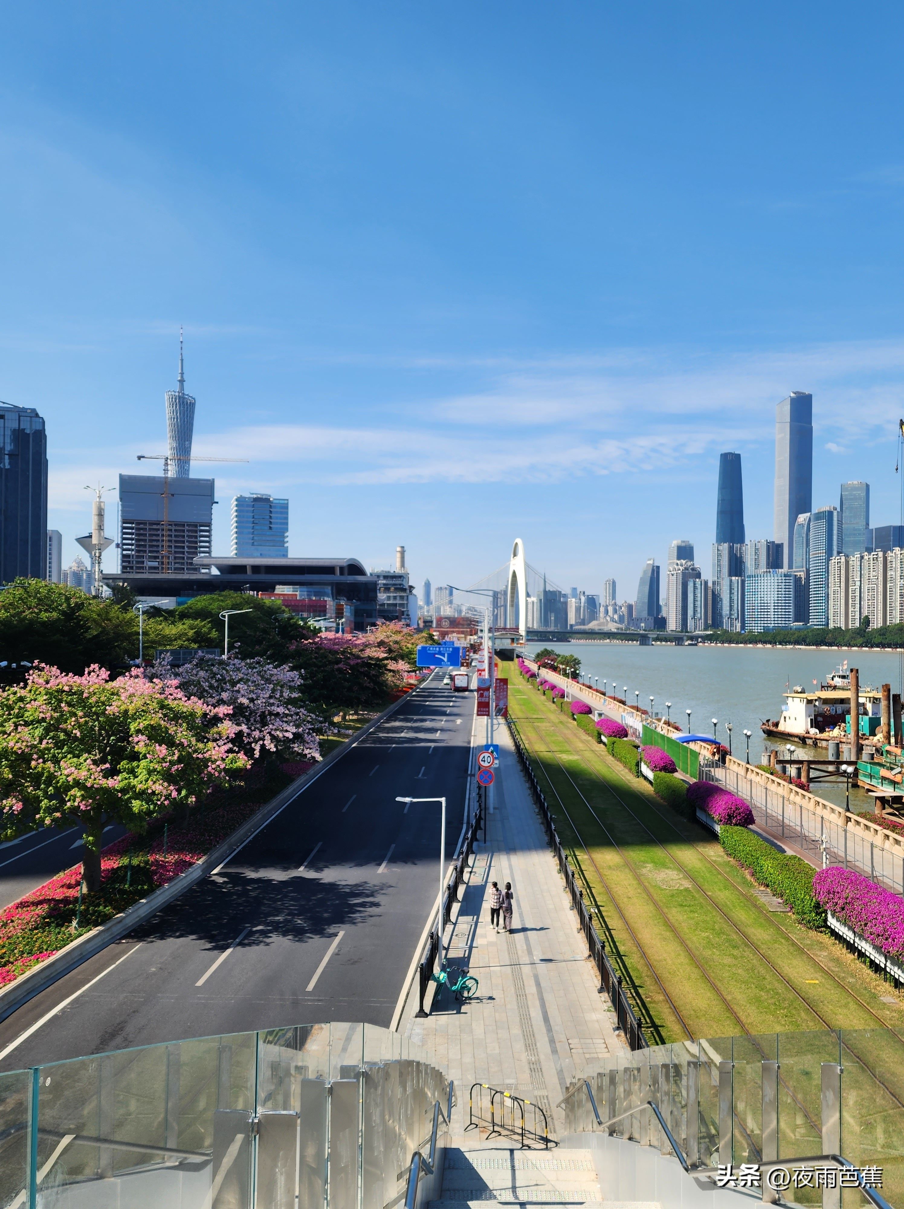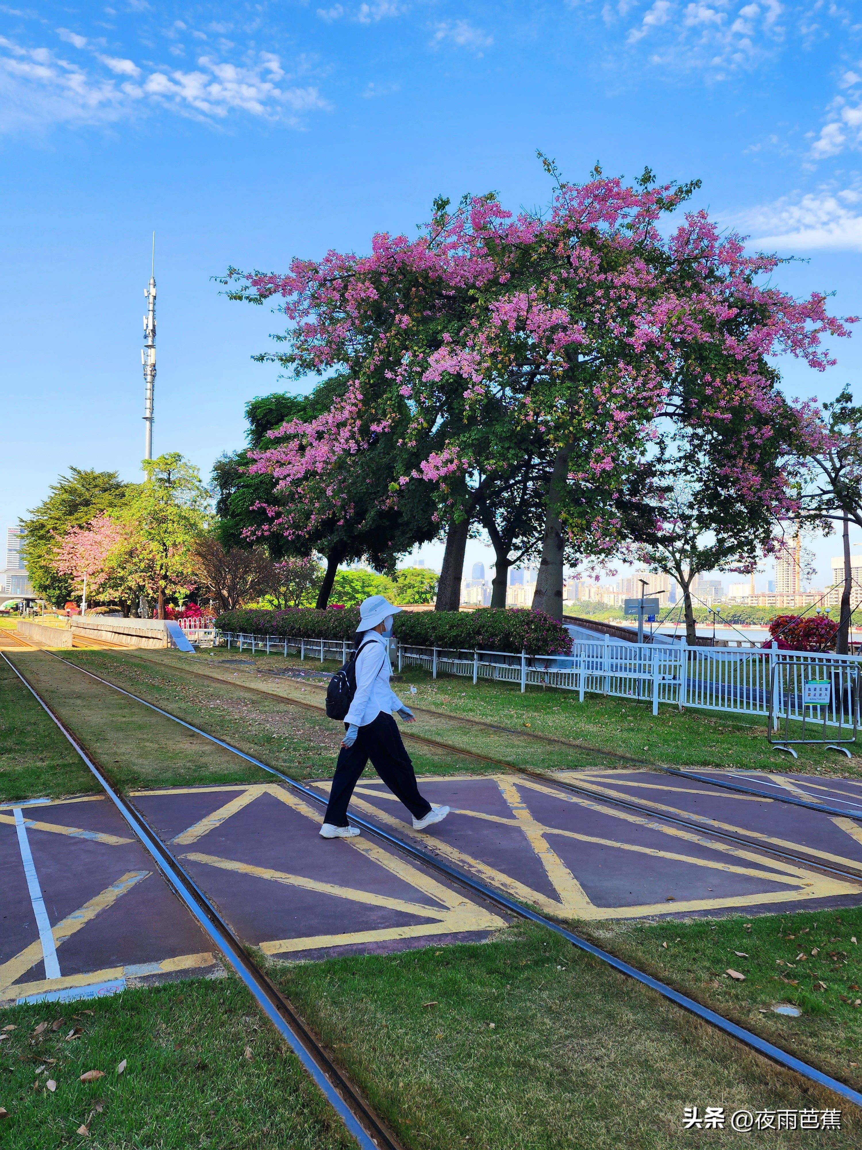 2、从琶洲大桥南站徒步前往会展东站,沿途异木棉与三角梅竞相绽放,仿佛踏入了宫崎骏笔下的漫画世界,美轮美奂。