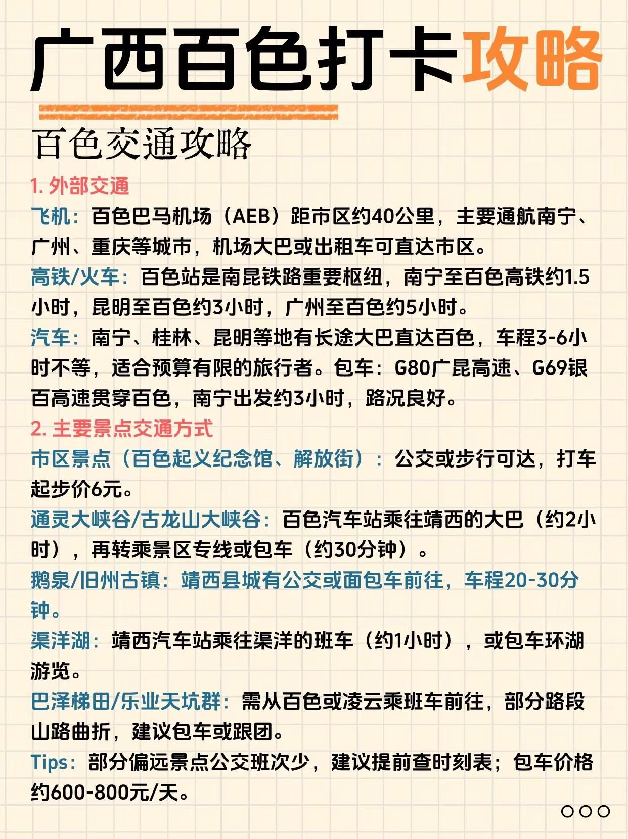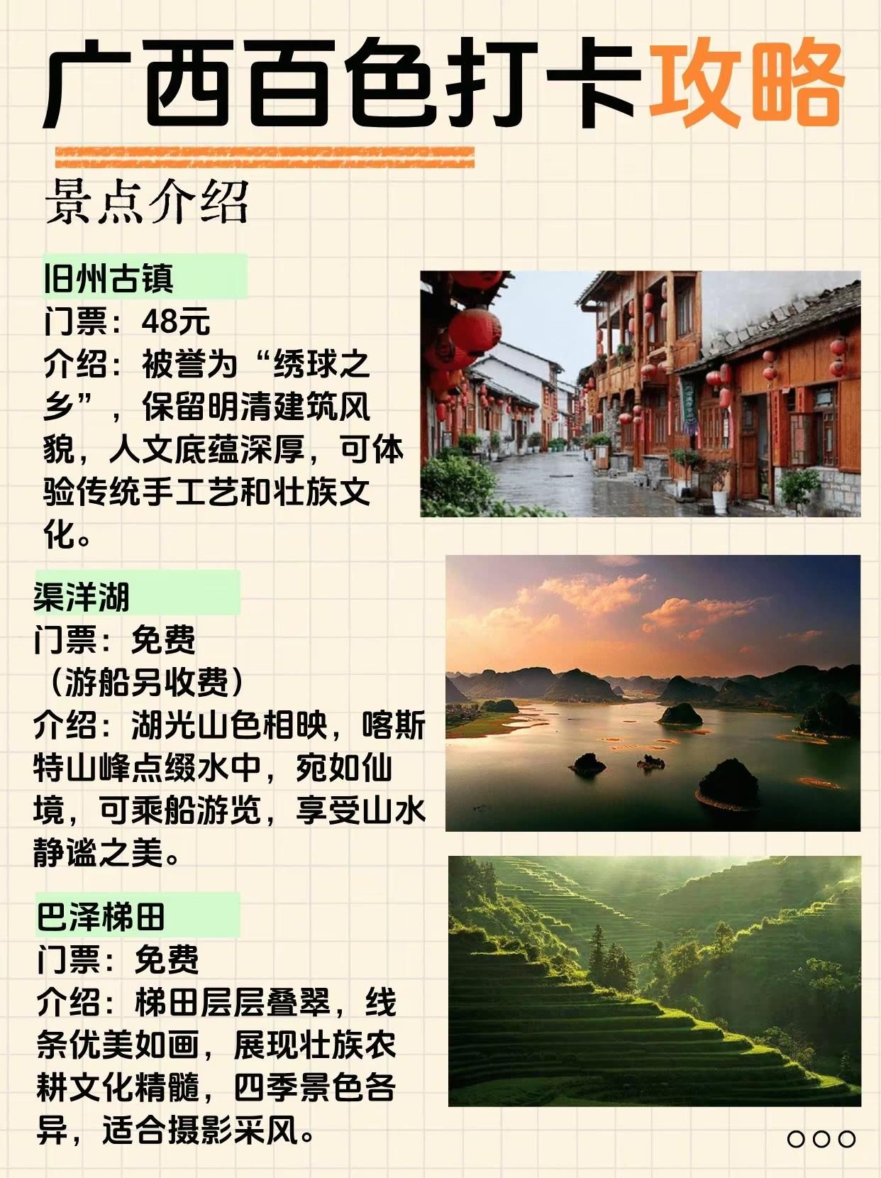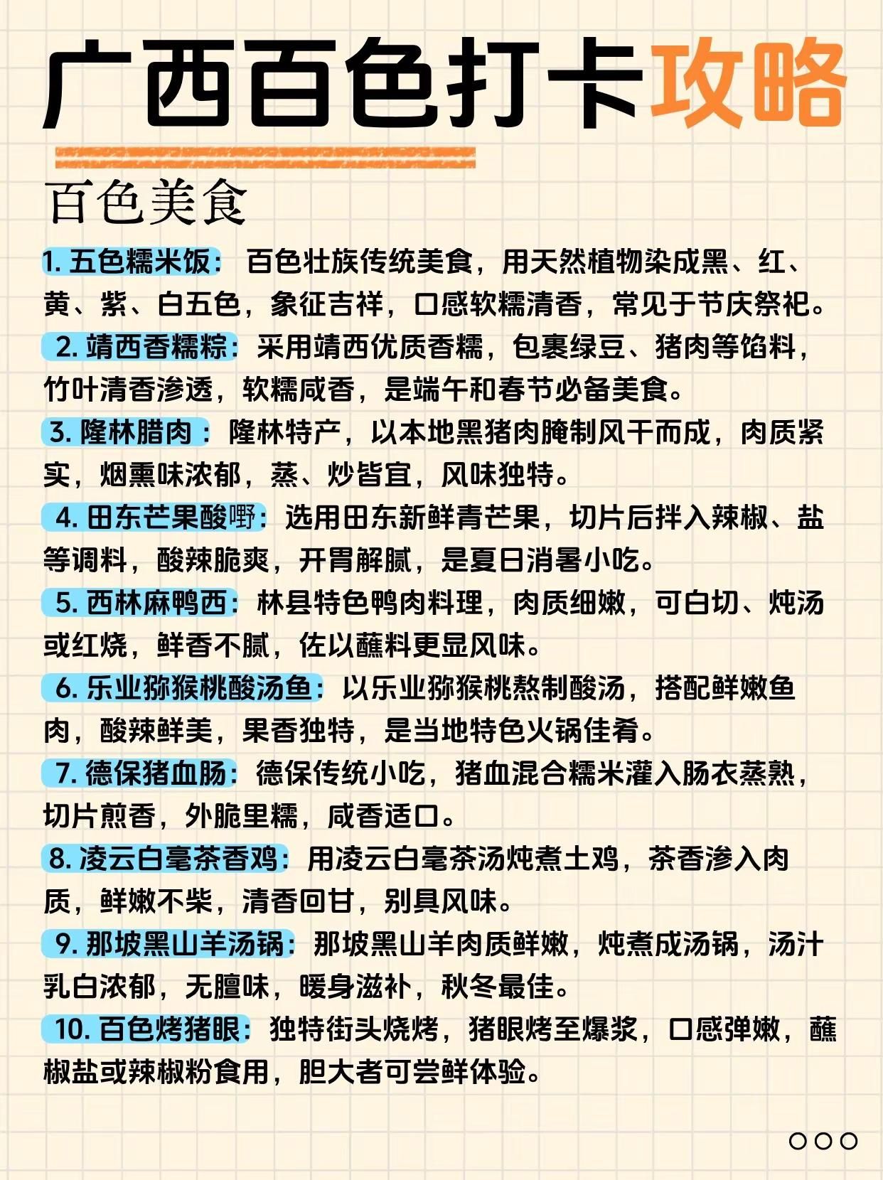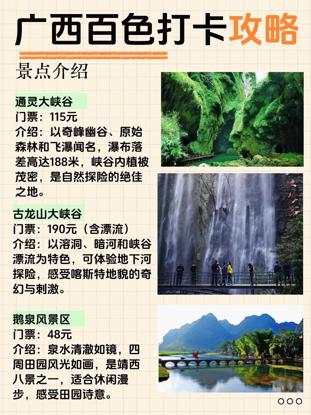 终于有人把百色旅游说明白了!来广西必打卡。通灵大峡谷——奇峰幽谷,瀑布飞流直下古龙山大峡谷——溶洞暗河,漂流探险胜地鹅泉风景区——泉水清澈,田园风光如画旧州古镇——绣球之乡,古韵人文荟萃渠洋湖——湖光山色,喀斯特水上仙境巴泽梯田——层层叠翠,农耕文化瑰宝爱布瀑布群——三级跌落,天然氧吧秘境三叠岭瀑布——悬空飞瀑,气势磅礴壮观二郎瀑布——原始野趣,隐于山林之间-百色路线指南百色一日游路线:百色起义纪念馆 - 解放街 - 通灵大峡谷-百色二日游Day1:通灵大峡谷 - 古龙山大峡谷Day2:鹅泉 - 旧州古镇-百色三日游Day1:通灵大峡谷 - 古龙山大峡谷Day2:鹅泉 - 旧州古镇 - 渠洋湖Day3:巴泽梯田 - 乐业大石围天坑-崇左+百色4日游Day1(崇左):德天瀑布 - 明仕田园Day2(崇左百色):通灵大峡谷 - 古龙山大峡谷Day3(百色):鹅泉 - 旧州古镇 - 渠洋湖Day4(百色):巴泽梯田 - 百色起义纪念馆-百色美食1. 五色糯米饭 2. 靖西香糯粽3. 隆林腊肉 4. 田东芒果酸嘢5. 西林麻鸭6. 乐业猕猴桃酸汤鱼7. 德保猪血肠8. 凌云白毫茶香鸡-#创作者扶持计划 #广西旅游 #百色 #靖西 #通灵大峡谷