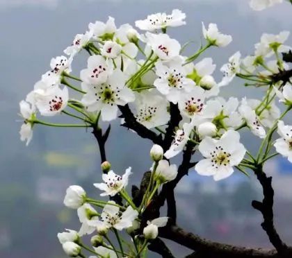 * 万亩梨花竞相开放,如雪似云,蔚为壮观。