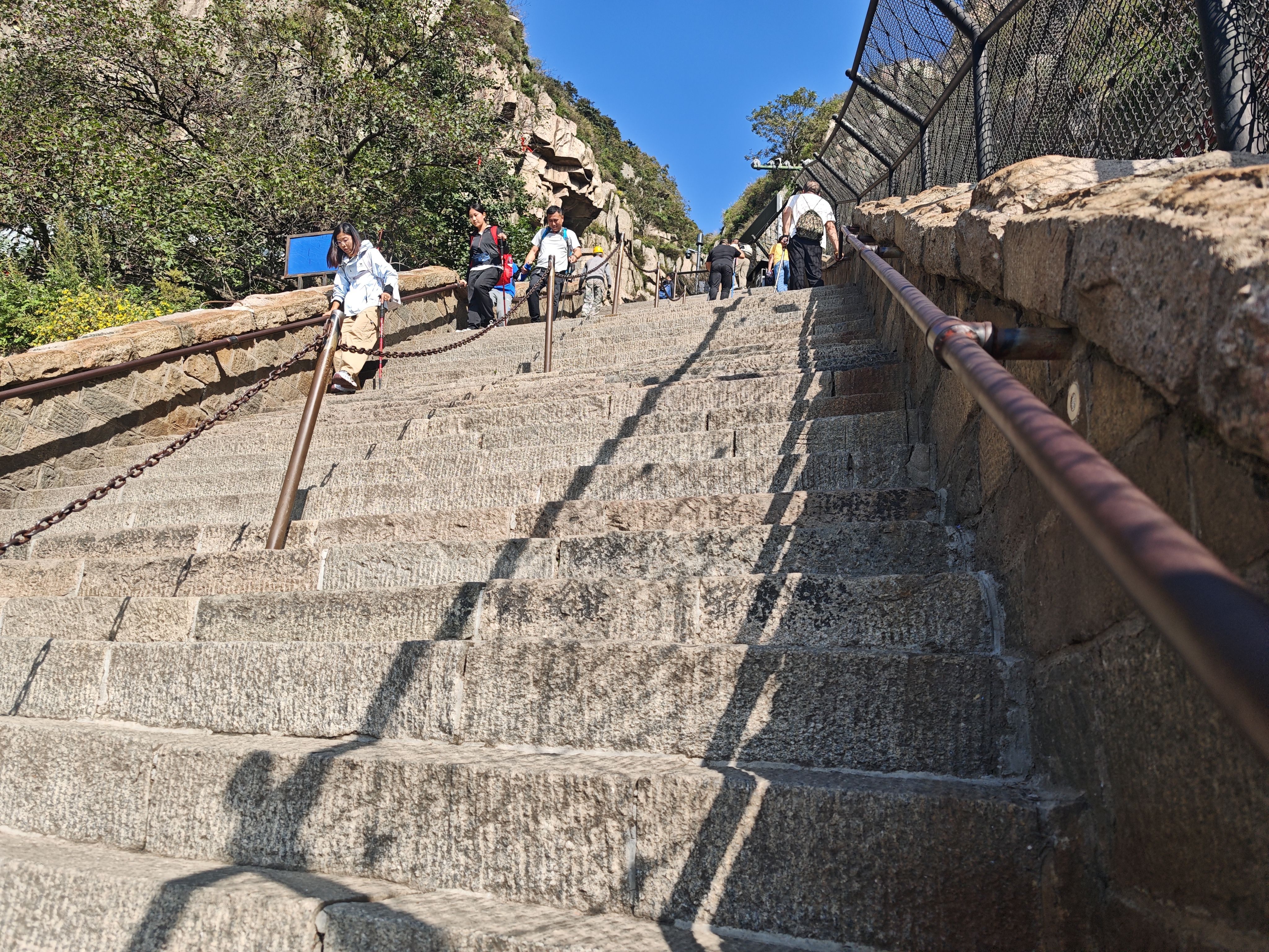 对于体力好的人来讲,游览泰山最经典的路线是从红门出发,我还算是有自知之明,选择从太平村坐大巴到中天门,然后徒步再爬南天门登玉皇顶,上下全程用时三个小时。实际上刚下摆渡车就开始焦虑了,总觉得身体哪哪不舒服,担心背包负重大,怕太阳晒,一切都指向徒步登顶的可能性为零!硬着头皮爬了几十阶石梯,喘气有些吃力,腿肚子抽抽,脚后跟儿隐疼,几度想折回来坐缆车上南天门。此时迎头遇到夜爬下山的队伍,一个个步履轻松,面露得意之色,细看人群中竞有老有小,心下一狠,爬就完了!