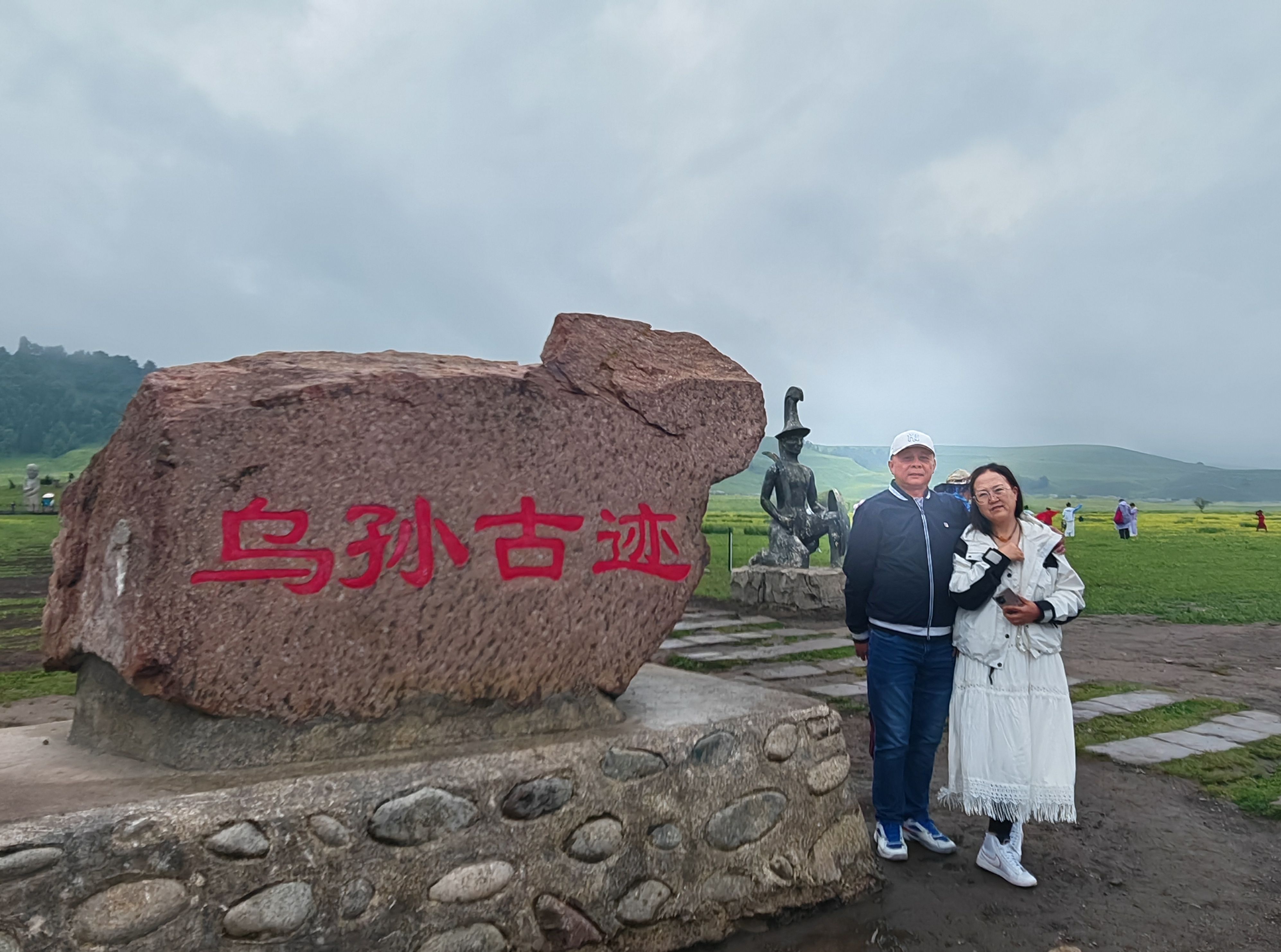 27日10点从温泉县山野酒店出发,中午12点到景区东门。在11点30分左右,道路两旁的云雾、青山、草甸、河流、牛羊就已经宛如画面,在道路两侧徐徐展开。进去时小雨淅淅沥沥,在乌孙古迹稍作停留。乌孙古国是汉代西域的重要的游牧民族,主要活动区域就在伊犁河流域,包括那拉提。这里大概有乌孙人的墓葬或者传说吧。由于下雨,没有进去参观。